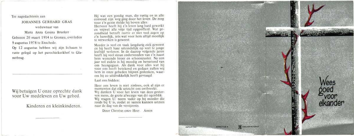 GRAS, Johannes Gerhard, geboren op 20-3-1914 te Gronau, Dld, overleden op 9-8-1978 te Enschede op 64-jarige leeftijd, begraven op 12-8-1978 te Glanerbrug.