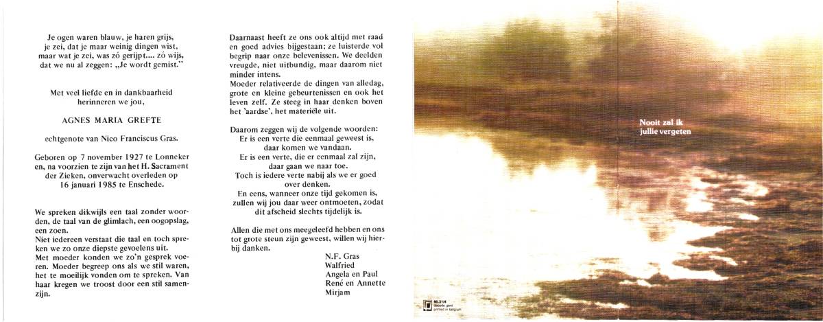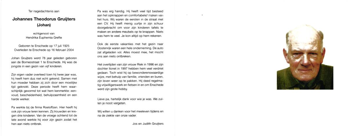 GREFTE, Hendrikus Johannes, geboren op 28-7-1924 te Lonneker, overleden op 5-12-1989 te Enschede op 65-jarige leeftijd, gecremeerd op 8-12-1989 te Usselo.