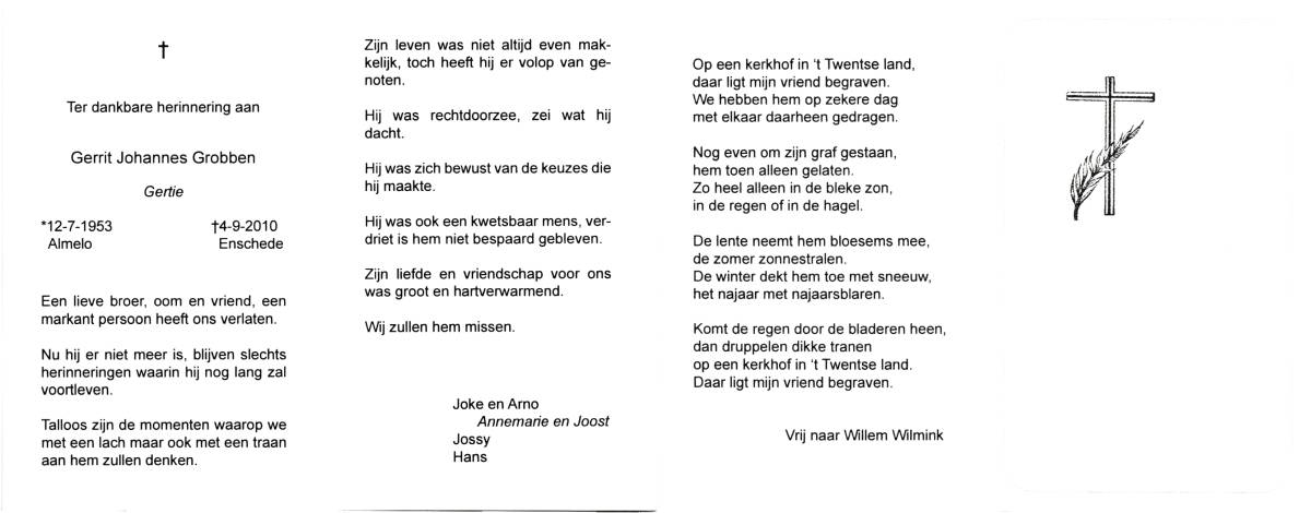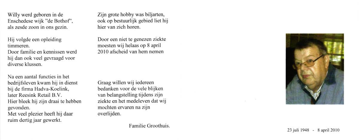 GROOTHUIS, Willy, geboren op 23-7-1948 te Enschede, overleden op 8-4-2010 op 61-jarige leeftijd.