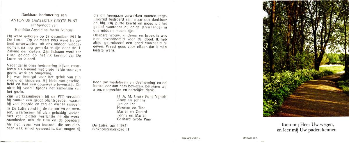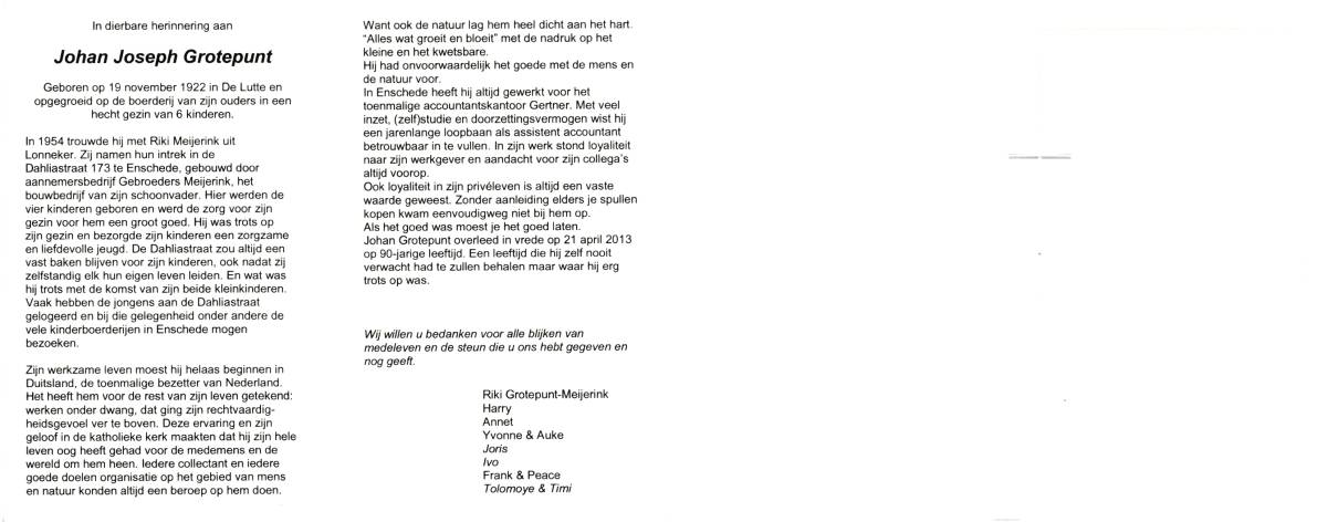 GROTE PUNT, Johannes Lambertus, geboren op 11-12-1886 te De Lutte, overleden op 19-11-1956 te De Lutte op 69-jarige leeftijd, begraven op 23-11-1956 te De Lutte.