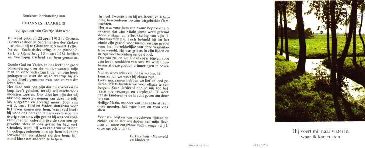 HAARHUIS, Johannes, geboren op 22-4-1913 te Gronau, Dld, overleden op 8-3-1984 te Glanerbrug op 70-jarige leeftijd, begraven op 13-3-1984 te Glanerbrug.
