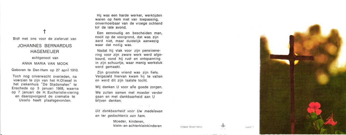 HAGEMEIJER, Johannes Bernardus, geboren op 27-4-1910 te Den Ham, overleden op 3-1-1988 te Enschede, ziekenhuis op 77-jarige leeftijd, gecremeerd op 7-1-1988 te Usselo (Gem. Enschede).