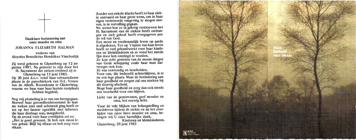 HALMAN, Johanna Elizabeth, geboren op 12-8-1907 te Glanerbrug, overleden op 15-6-1983 te Glanerbrug op 75-jarige leeftijd, begraven op 20-6-1983 te Glanerbrug.