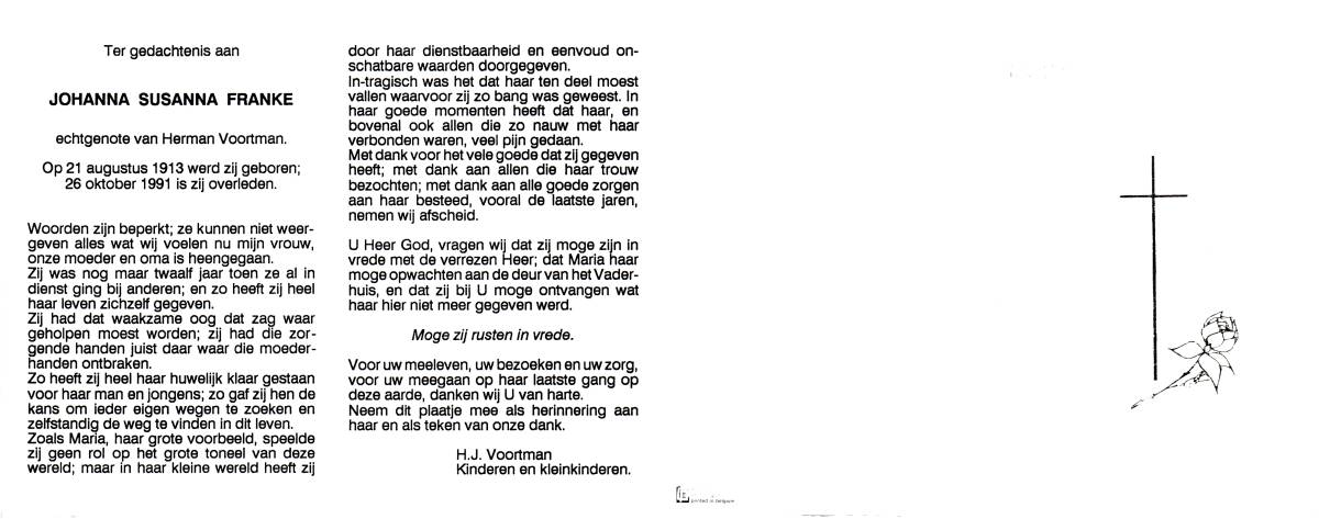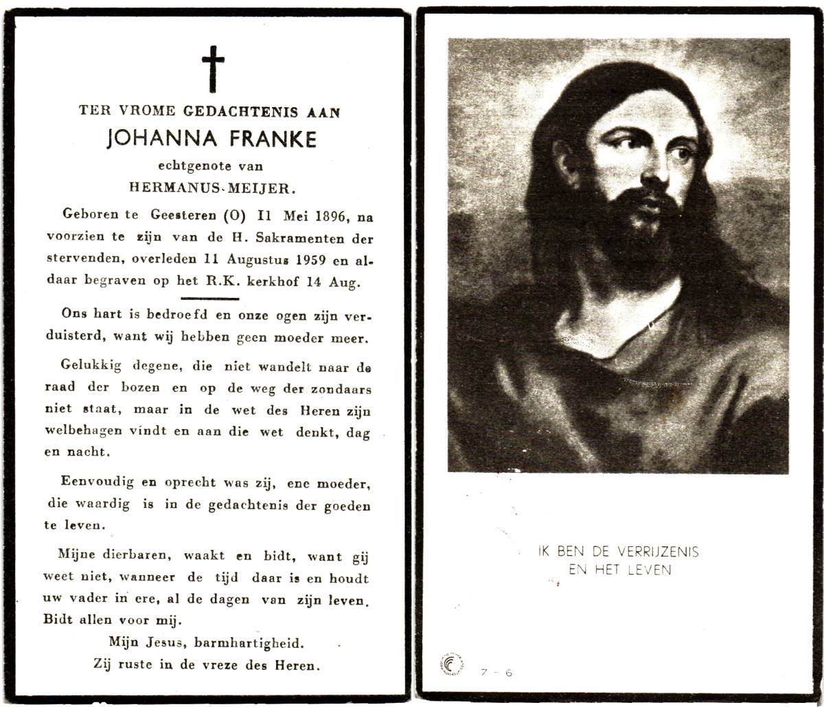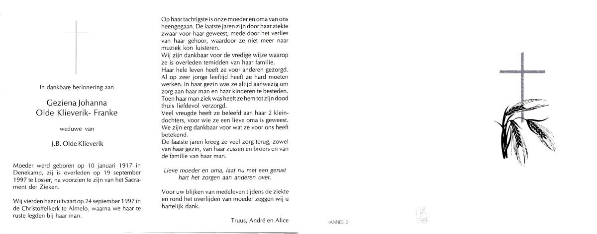 FRANKE, Geziena Johanna, geboren op 10-1-1917 te Denekamp, overleden op 19-9-1997 te Losser op 80-jarige leeftijd, begraven op 24-9-1997 te Almelo.