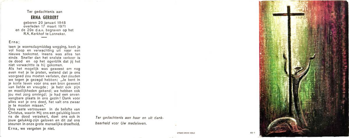 GERBERT, Erna, geboren op 20-1-1948, overleden op 17-3-1971 op 23-jarige leeftijd, begraven op 20-3-1971 te Lonneker.