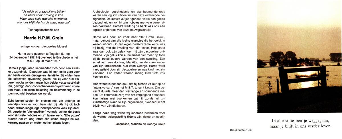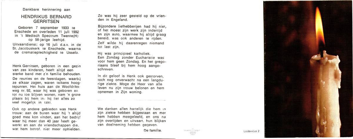 GERRITSEN, Hendrikus Bernard, geboren op 7-9-1933 te Enschede, overleden op 11-7-1992 te Enschede, ziekenhuis op 58-jarige leeftijd, gecremeerd op 16-7-1992 te Usselo.