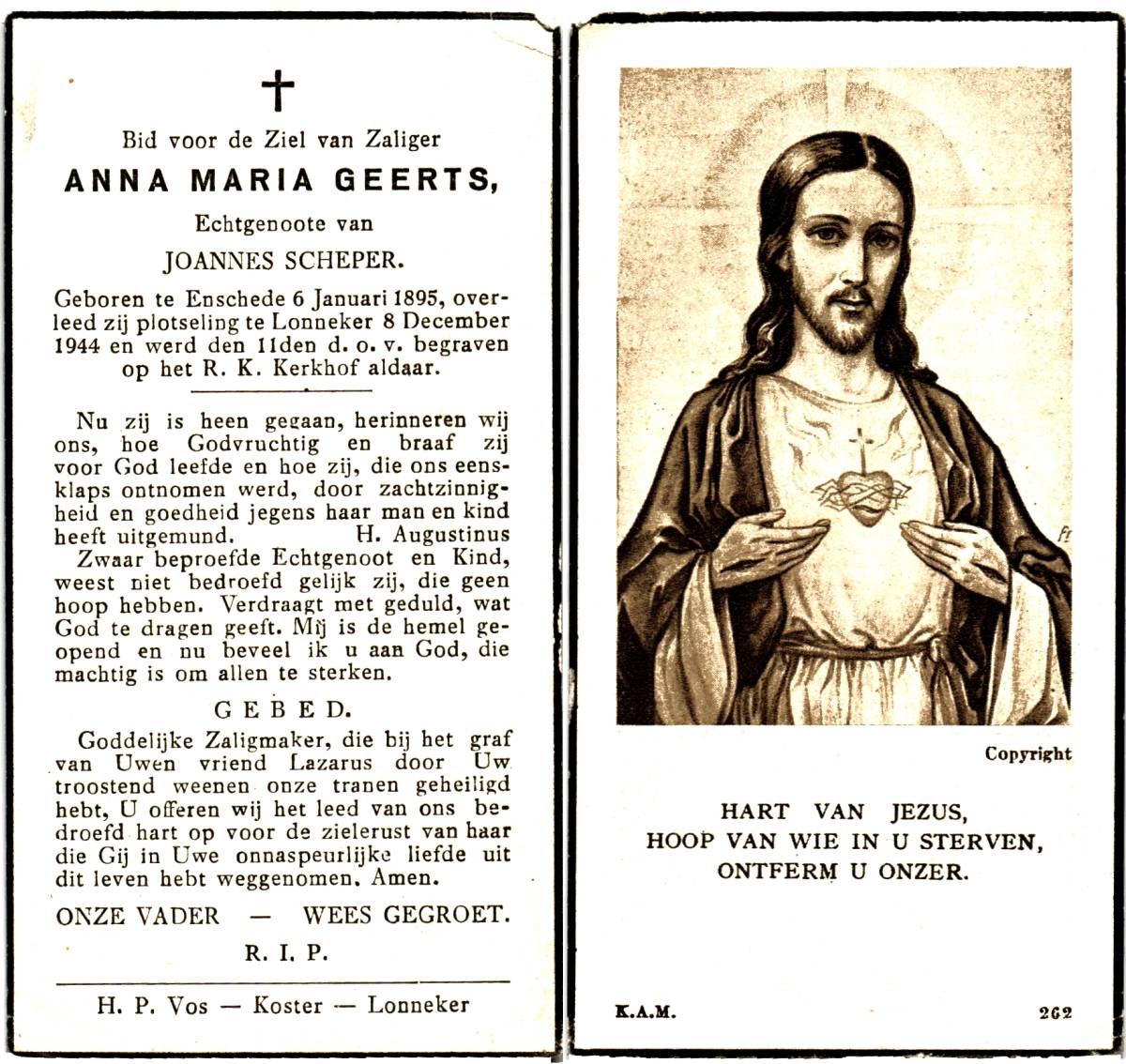 GEERTS, Anna Maria, geboren op 06-01-1895 te Enschede, overleden op 8-12-1944 te Lonneker op 49-jarige leeftijd, begraven op 11-12-1944 te Lonneker.