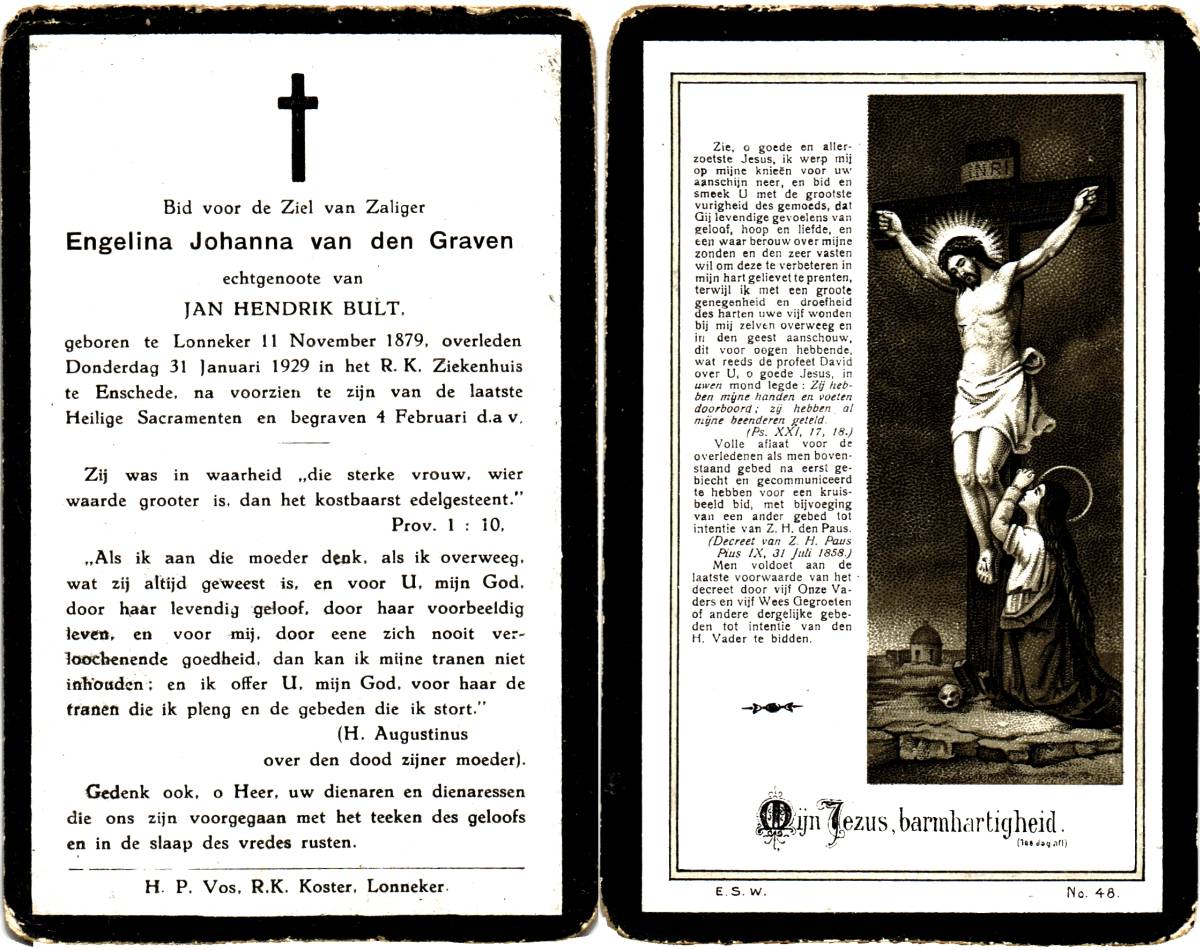 GRAVEN, van den, Engelina Johanna, geboren op 11-11-1879 te Lonneker, overleden op 31-1-1929 te Enschede, ziekenhuis op 49-jarige leeftijd, begraven op 4-2-1929.