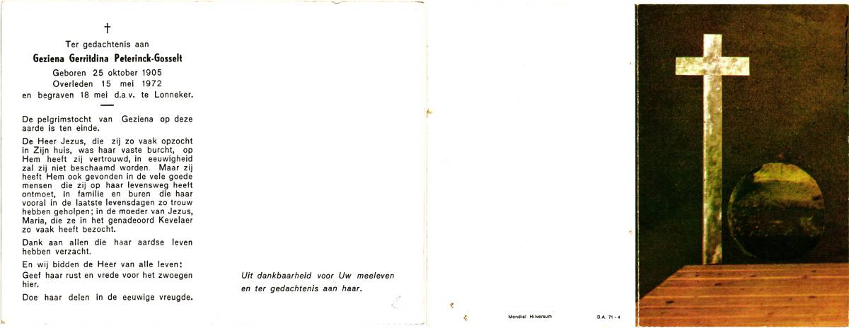 GOSSELT, Geziena Gerritdina, geboren op 25-10-1905, overleden op 15-5-1972 op 66-jarige leeftijd, begraven op 18-5-1972 te Lonneker.