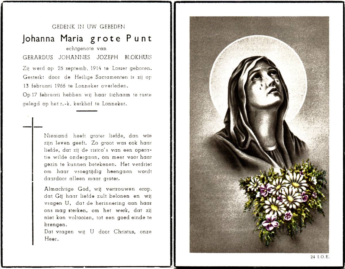 GROTE PUNT, Johanna Maria, geboren op 26-9-1914 te Losser, overleden op 13-2-1966 te Lonneker op 51-jarige leeftijd, begraven op 17-2-1966 te Lonneker.