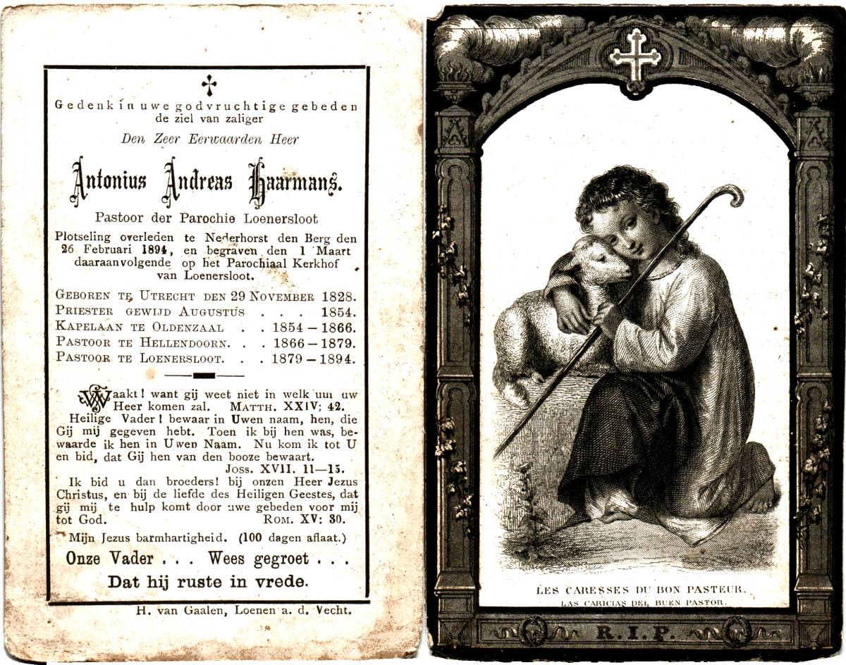 HAARMANS, Antonius Andreas, geboren op 29-11-1828 te Utrecht, overleden op 26-02-1894 te Nederhorst den Berg op 65-jarige leeftijd, begraven op 01-03-1894 te Loenersloot.