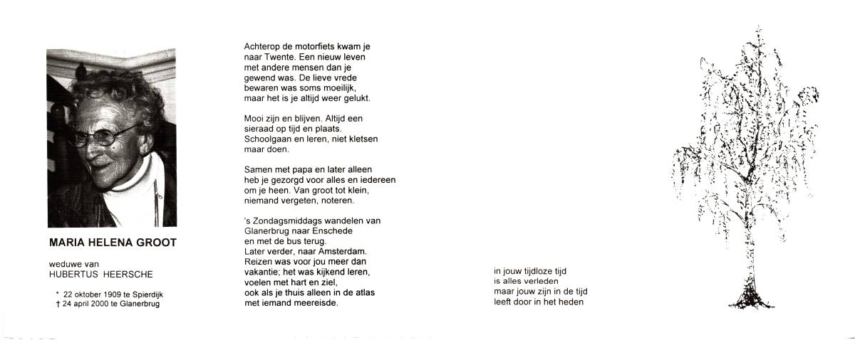 GROOT, Maria Helena, geboren op 22-10-1909 te Spierdijk, overleden op 24-4-2000 te Glanerbrug op 90-jarige leeftijd.