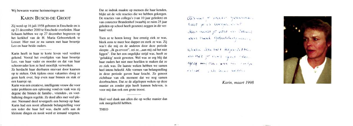 GROOT, de, Karin, geboren op 16-7-1958 te Enschede, overleden op 21-12-2000 te Enschede op 42-jarige leeftijd, begraven op 27-12-2000 te Losser.