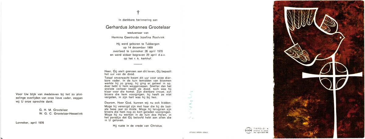 GROOTELAAR, Gerhardus Johannes, geboren op 14-12-1909 te Tubbergen, overleden op 26-4-1976 te Lonneker op 68-jarige leeftijd, begraven op 29-4-1976 te Lonneker.