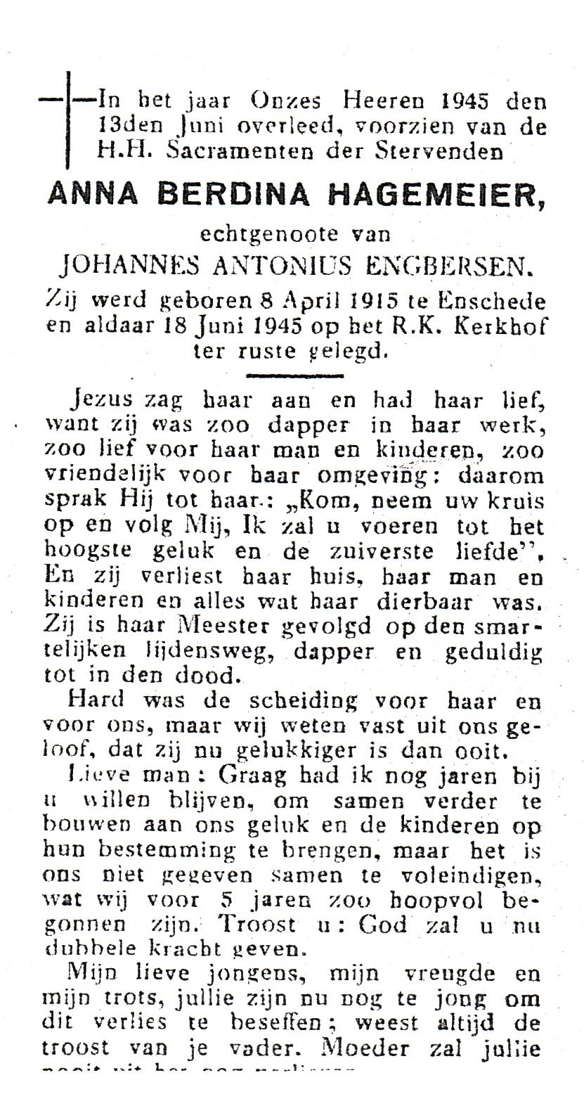 HAGEMEIER, Anna Berdina, geboren op 8-4-1915 te Enschede, overleden op 13-6-1945 te Enschede op 30-jarige leeftijd, begraven op 18-6-1945 te Enschede.