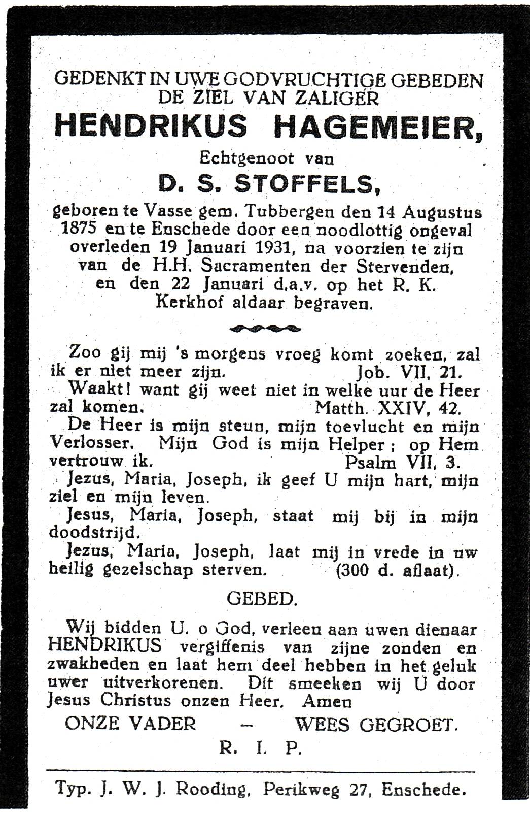 HAGEMEIER, Hendrikus, geboren op 14-08-1875 te Vasse, overleden op 19-1-1931 te Enschede op 56-jarige leeftijd, begraven op 22-1-1931 te Enschede.
