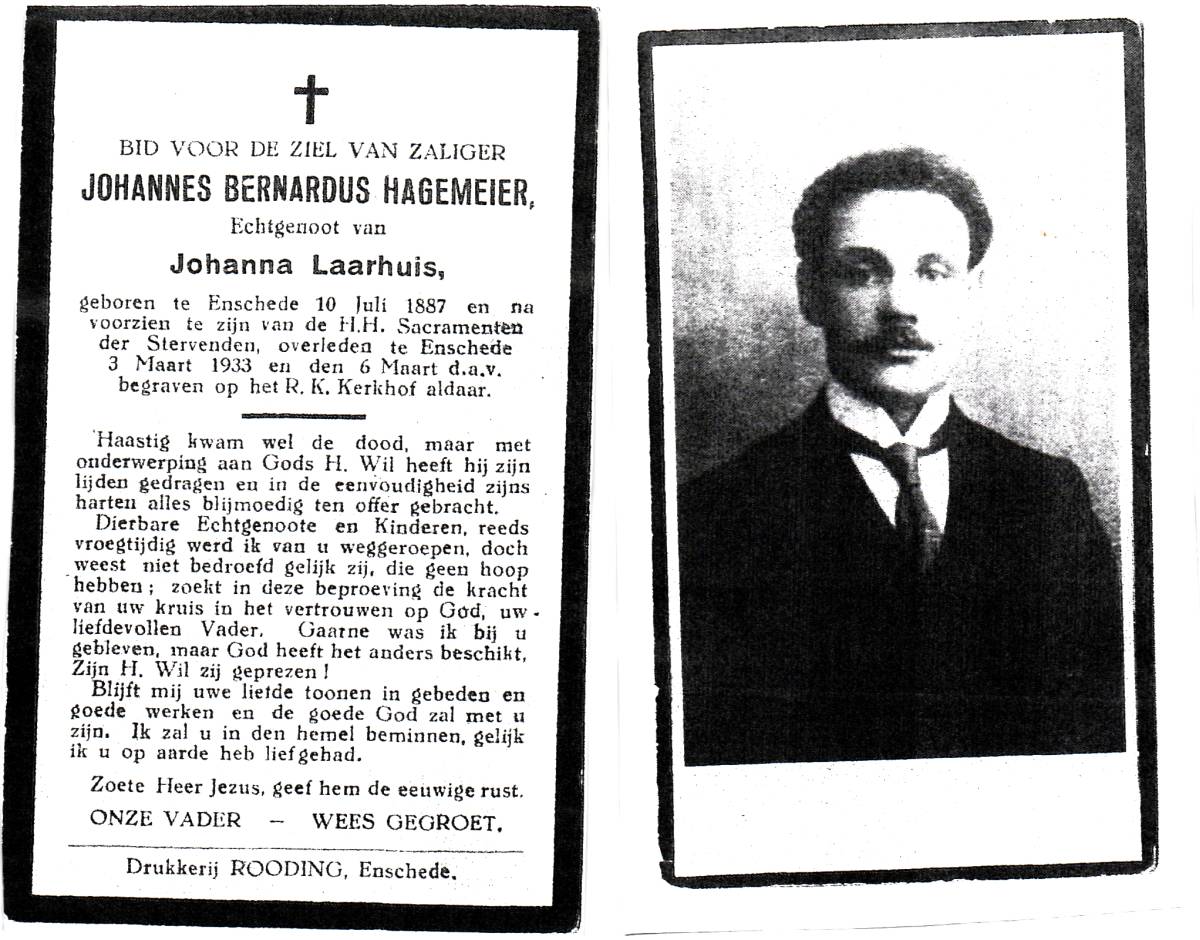 HAGEMEIER, Johannes Bernardus, geboren op 10-07-1887 te Enschede, overleden op 3-3-1933 te Enschede op 45-jarige leeftijd, begraven op 6-3-1933 te Enschede.
