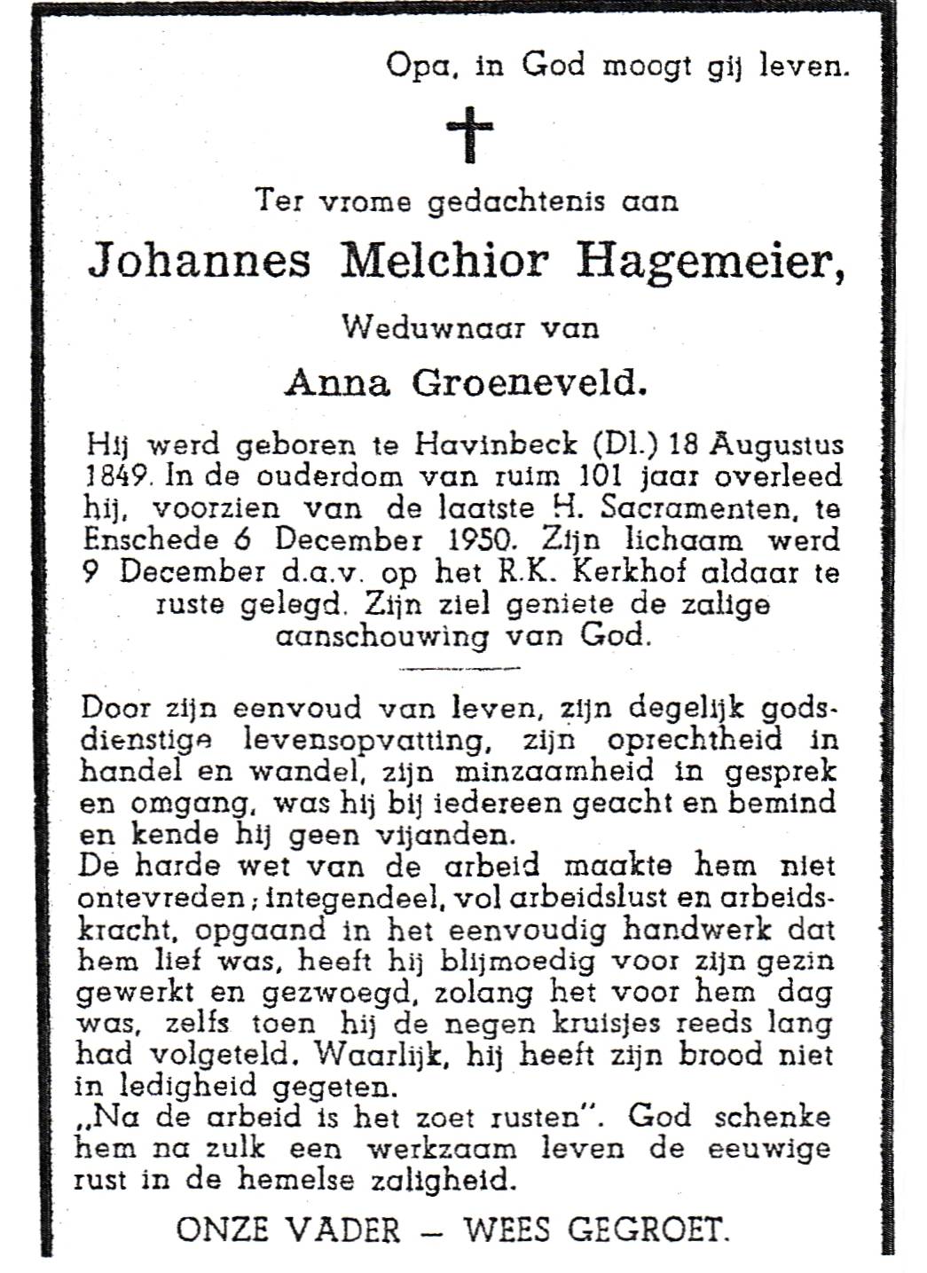 HAGEMEIER, Johannes Melchior, geboren op 18-08-1849 te Havinbeck, Dld, overleden op 6-12-1950 te Enschede op 101-jarige leeftijd, begraven op 9-12-1950 te Enschede.