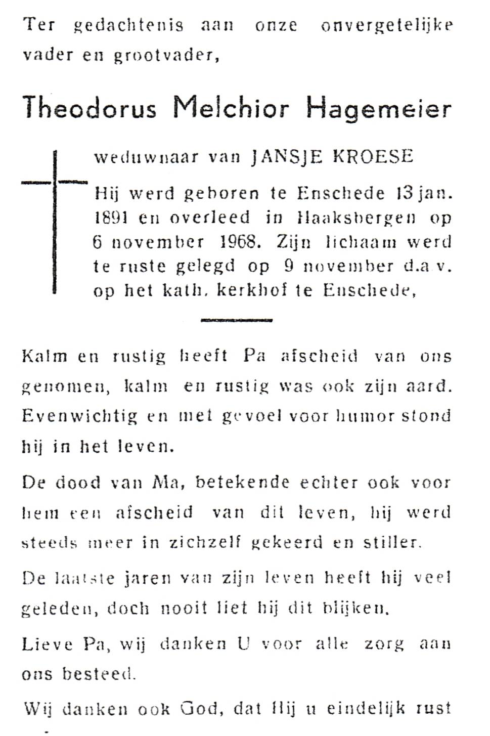HAGEMEIER, Theodorus Melchior, geboren op 13-01-1891 te Enschede, overleden op 6-11-1968 te Haaksbergen op 77-jarige leeftijd, begraven op 9-11-1968 te Enschede.