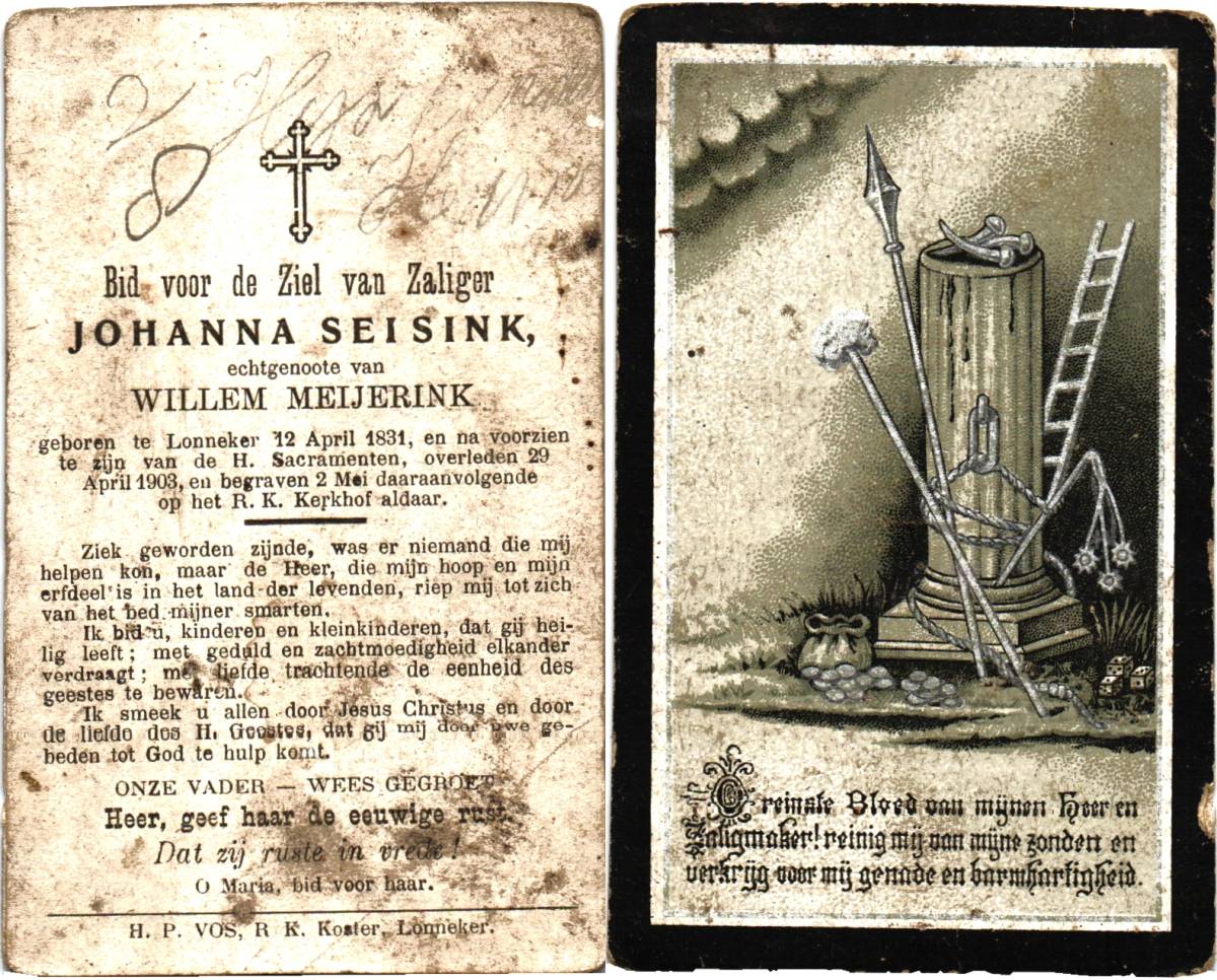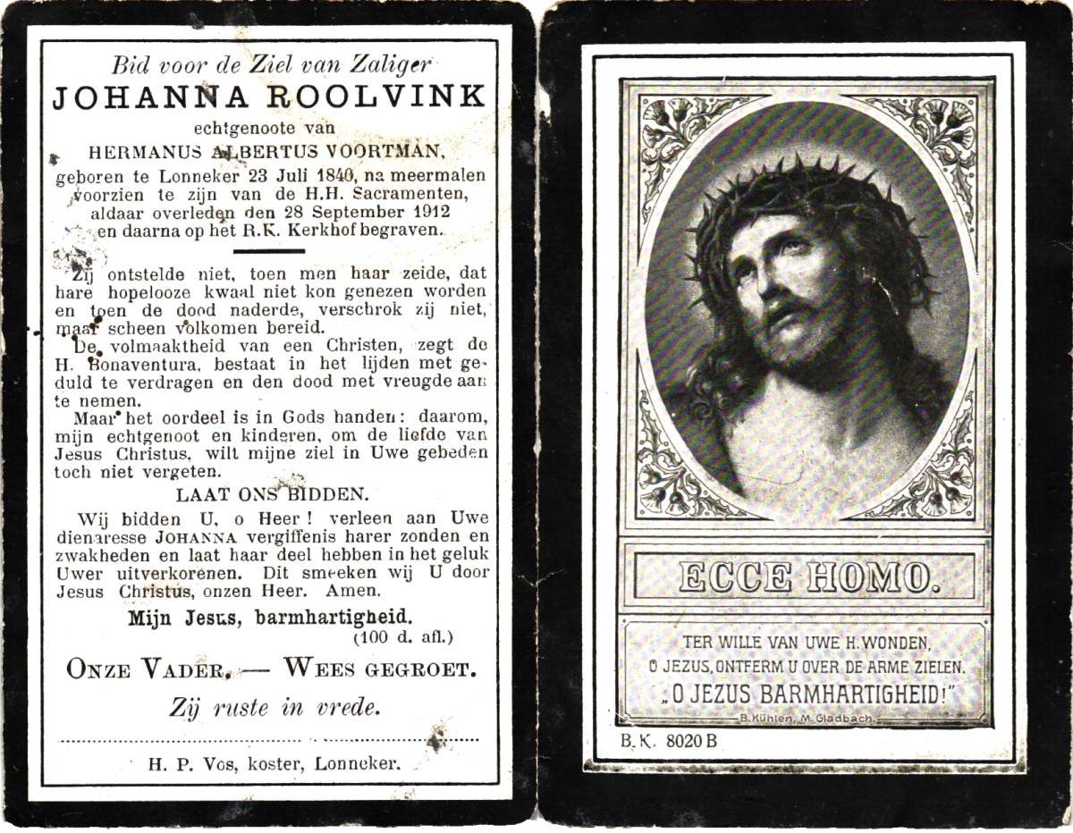 ROOLVINK, Johanna, geboren op 23-07-1840 te Lonneker, overleden op 28-9-1912 te Lonneker op 72-jarige leeftijd, begraven te Lonneker.