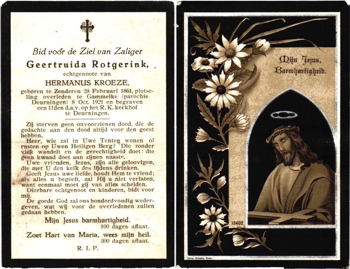ROTGERINK, Geertruida, geboren op 28-02-1861 te Zenderen, overleden op 8-10-1921 te Deurningen, Gammelke op 60-jarige leeftijd, begraven op 11-10-1921 te Deurningen.