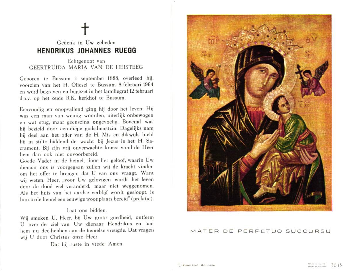 RUEGG, Hendrikus Johannes, geboren op 11-09-1888 te Bussum, overleden op 8-2-1964 te Bussum op 75-jarige leeftijd, begraven op 12-2-1964 te Bussum.