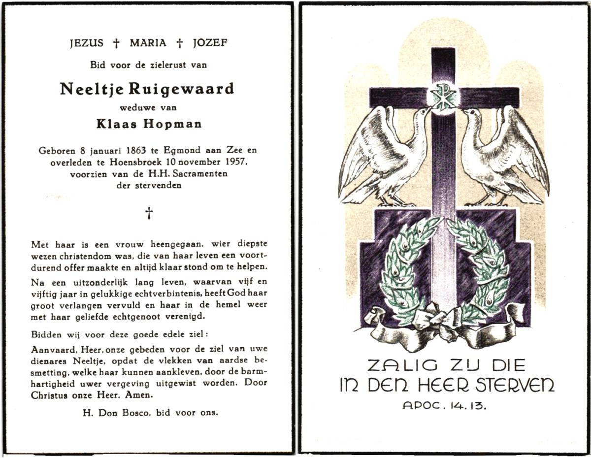 RUIGEWAARD, Neeltje, geboren op 08-01-1863 te Egmond aan Zee, overleden op 10-11-1957 te Hoensbroek op 94-jarige leeftijd.