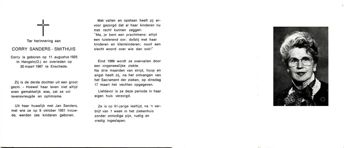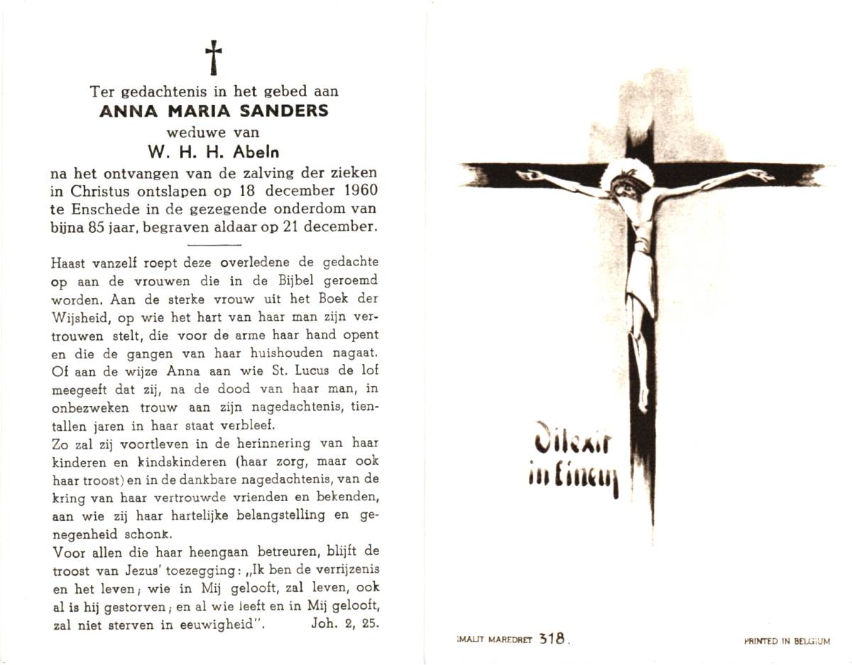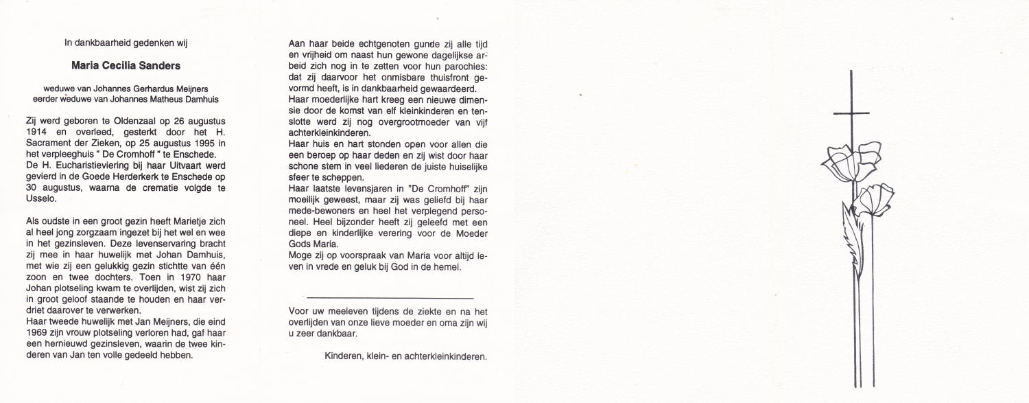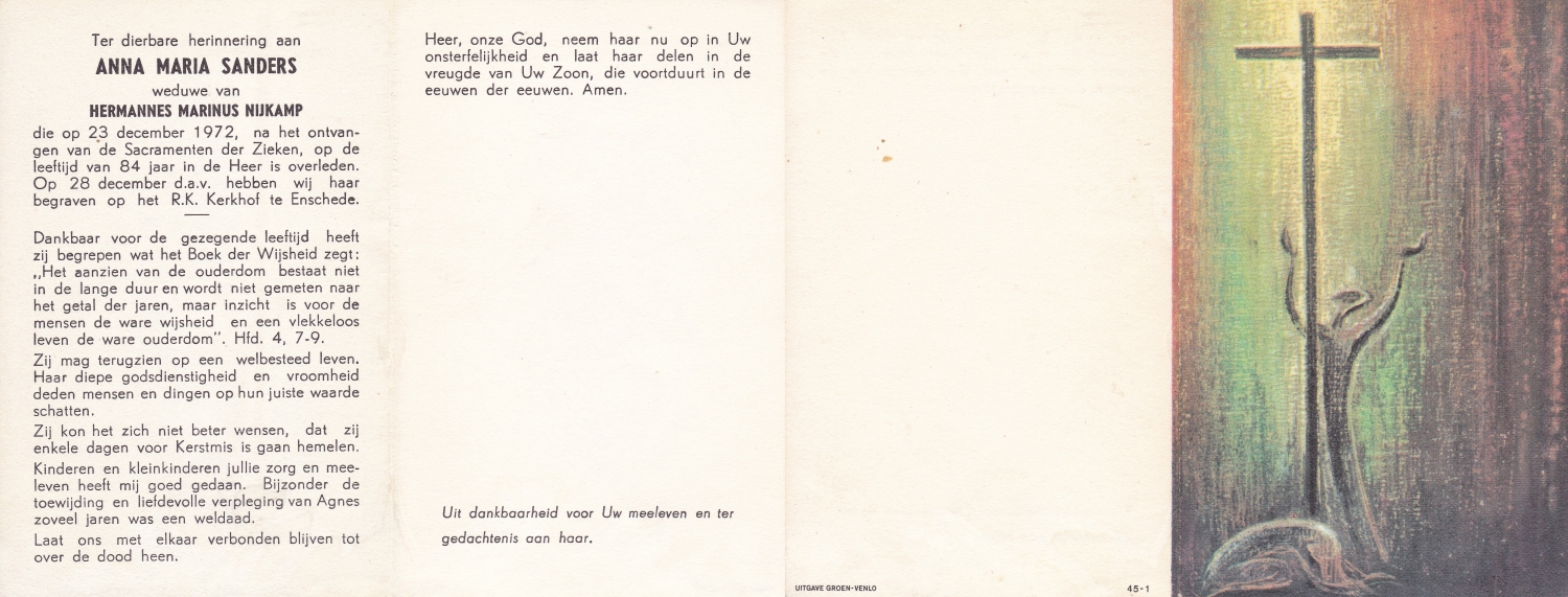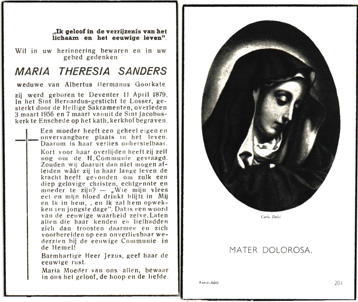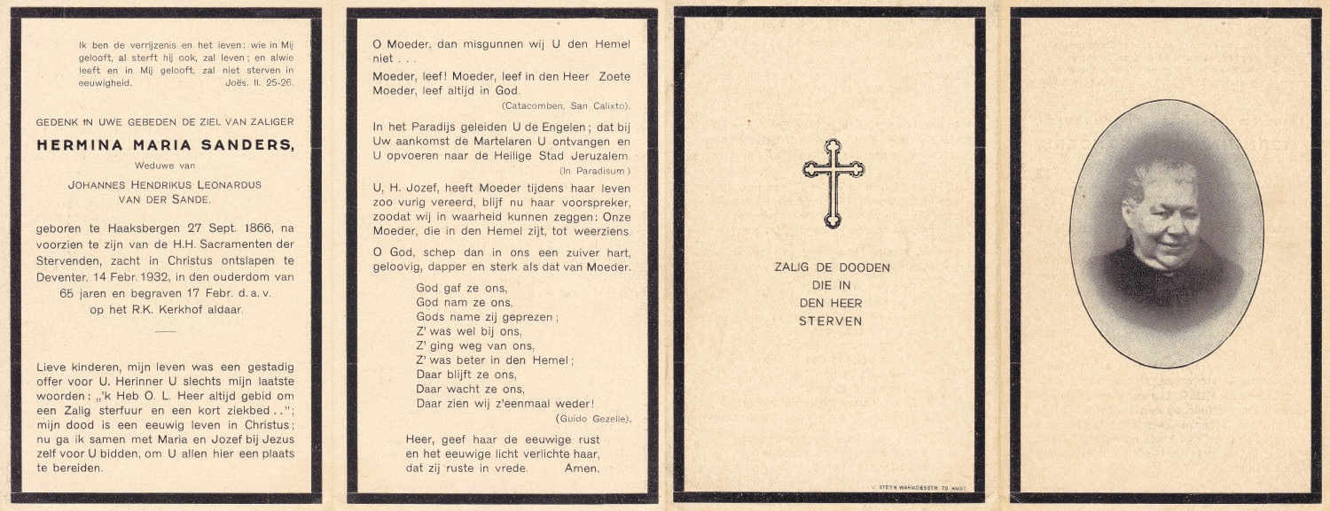 SANDERS, Johanna Maria, geboren op 01-04-1870 te Hengelo, overleden op 7-2-1951 te Enschede op 80-jarige leeftijd, begraven op 10-2-1951 te Hengelo.