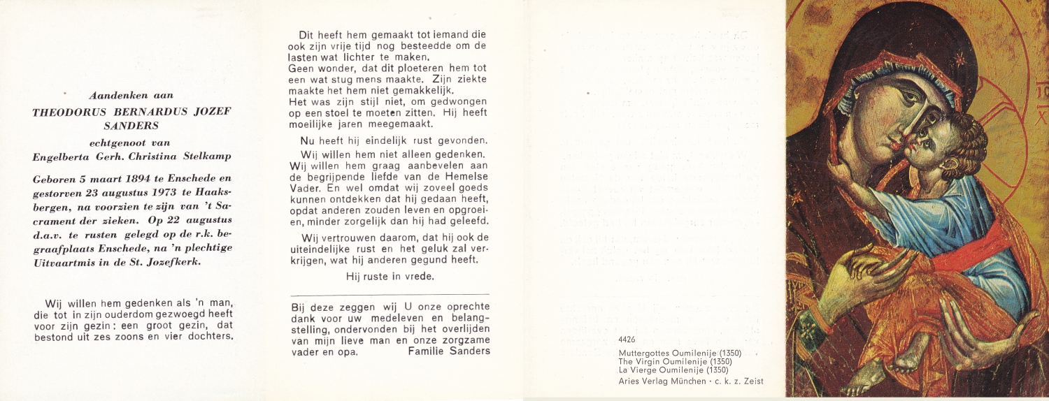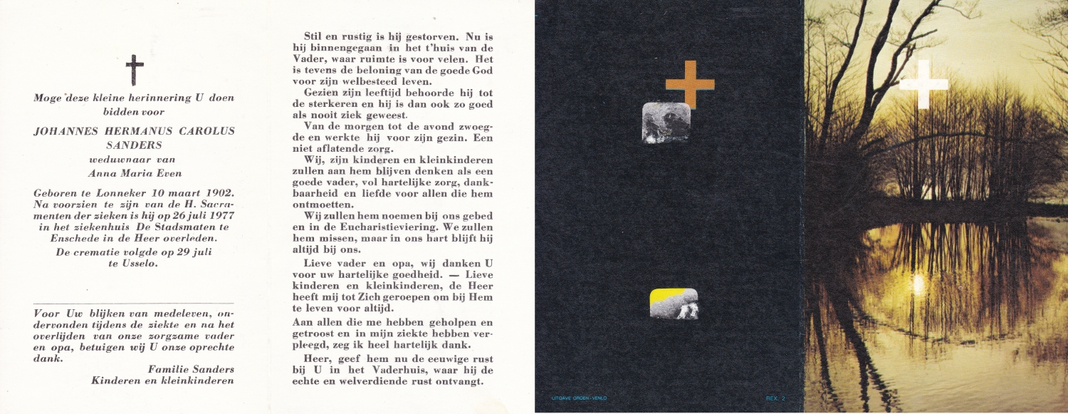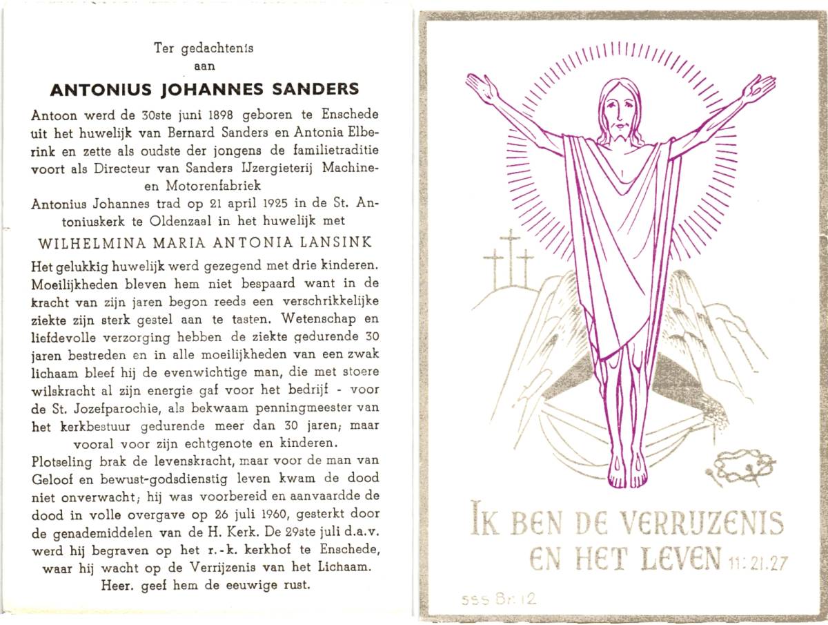SANDERS, Antonius Johannes, geboren op 30-06-1898 te Enschede, overleden op 26-7-1960 te Enschede op 62-jarige leeftijd, begraven op 29-7-1960 te Enschede.