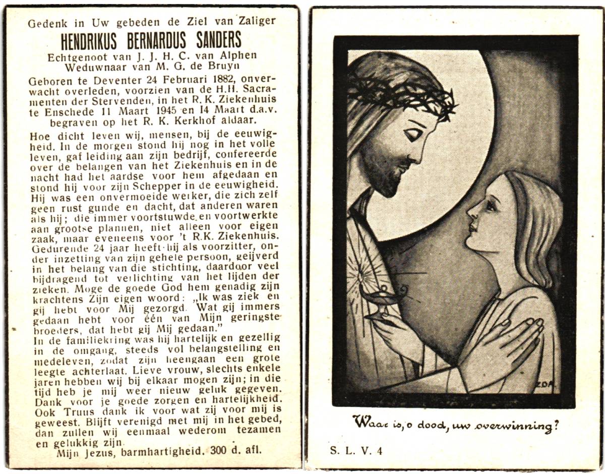 SANDERS, Hendrikus Bernardus, geboren op 24-02-1882 te Deventer, overleden op 11-3-1945 te Enschede, ziekenhuis op 63-jarige leeftijd, begraven op 14-3-1945 te Enschede.