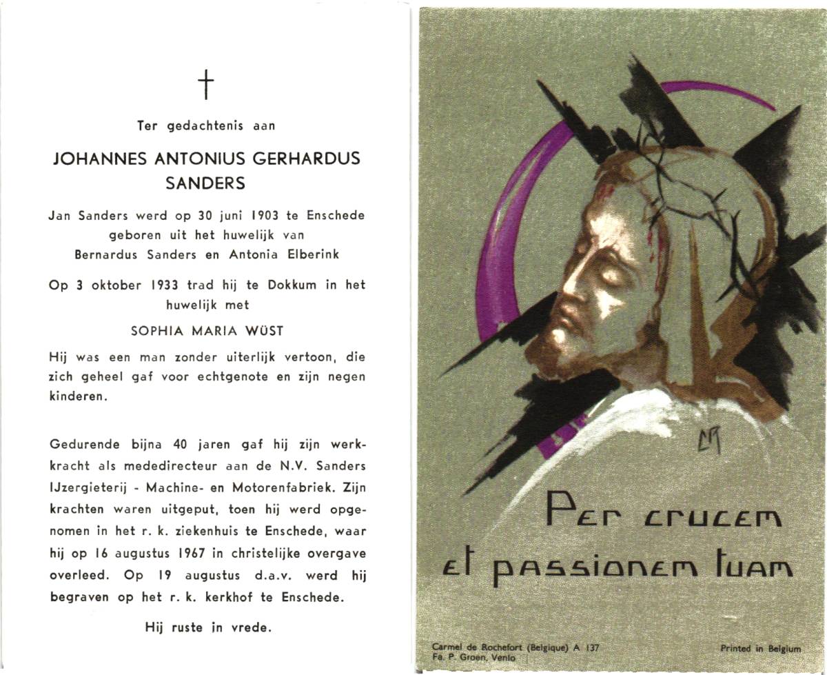 SANDERS, Johannes Antonius Gerhardus, geboren op 30-6-1903 te Enschede, overleden op 16-8-1967 te Enschede, ziekenhuis op 64-jarige leeftijd, begraven op 19-8-1967 te Enschede.