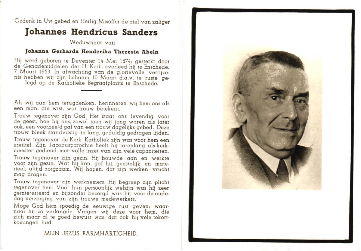 SANDERS, Johannes Hendricus, geboren op 14-05-1874 te Deventer, overleden op 7-3-1953 te Enschede op 78-jarige leeftijd, begraven op 10-3-1953 te Enschede.