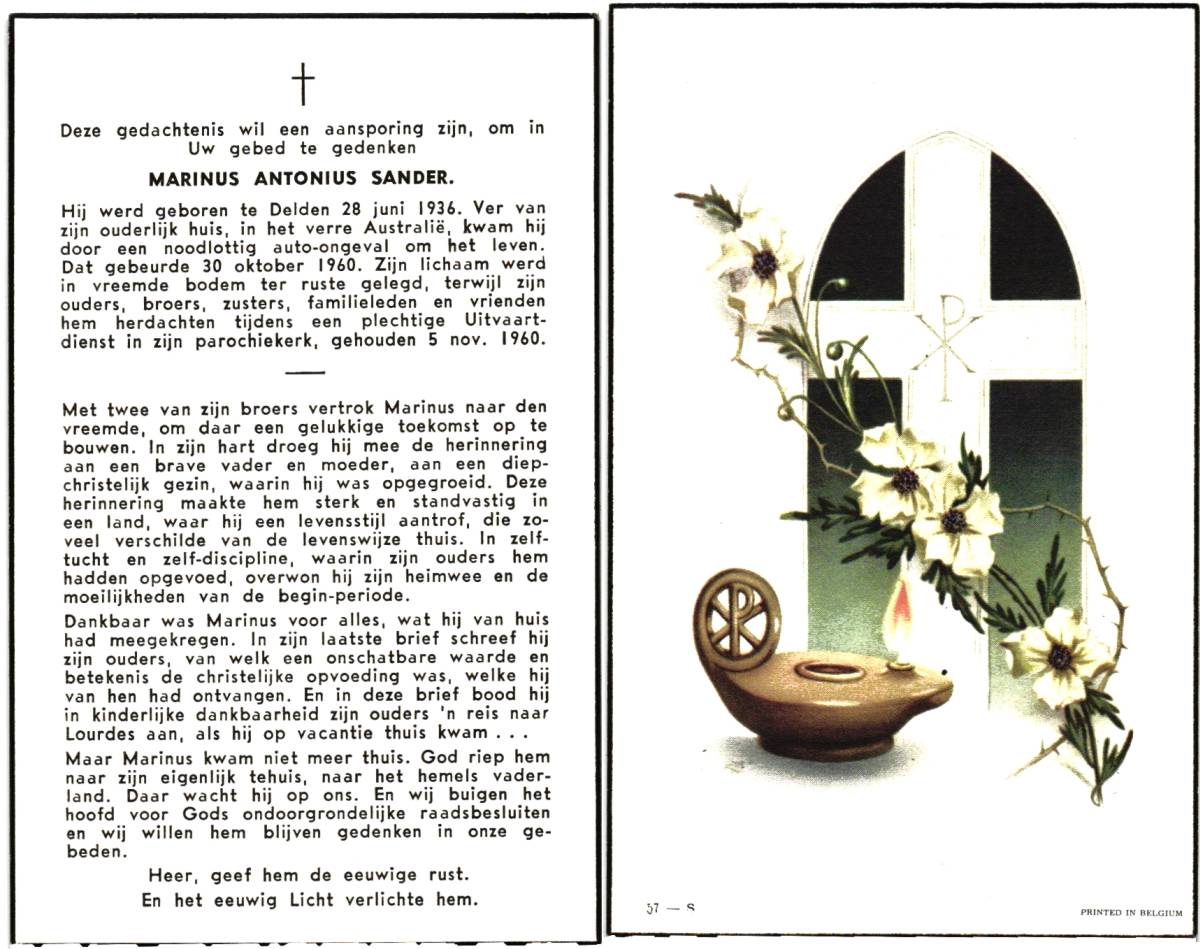 SANDER, Marinus Antonius, geboren op 28-6-1936 te Delden, overleden op 30-10-1960 te Australie op 24-jarige leeftijd, begraven op 5-11-1960 te Australie.