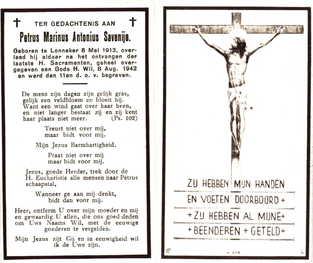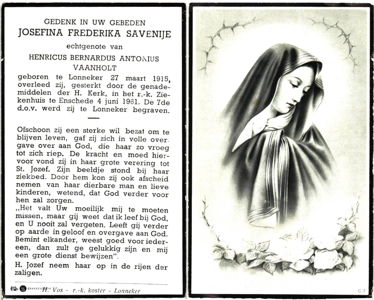 SAVENIJE, Josephina Frederika, geboren op 27-3-1915 te Lonneker, overleden op 4-6-1961 te Enschede, ziekenhuis op 46-jarige leeftijd, begraven op 7-6-1961 te Lonneker.