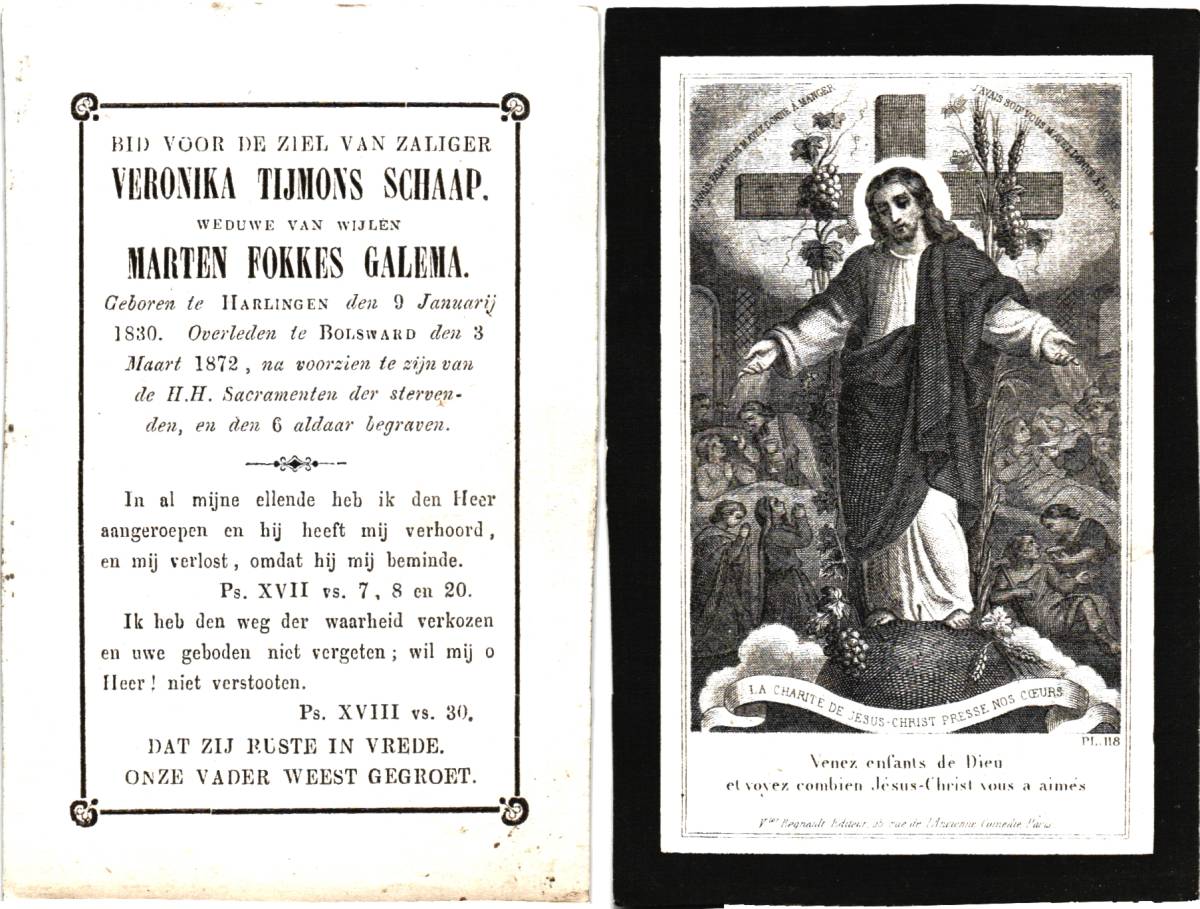 SCHAAP, Veronika Tijmons, geboren op 09-01-1830 te Harlingen, overleden op 03-03-1872 te Bolsward op 42-jarige leeftijd, begraven op 06-03-1872 te Bolsward.