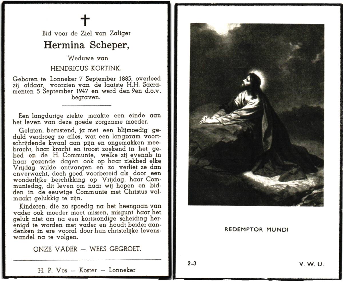 SCHEPER, Hermina, geboren op 07-09-1885 te Lonneker, overleden op 5-9-1947 te Lonneker op 61-jarige leeftijd, begraven op 9-9-1947 te Lonneker.