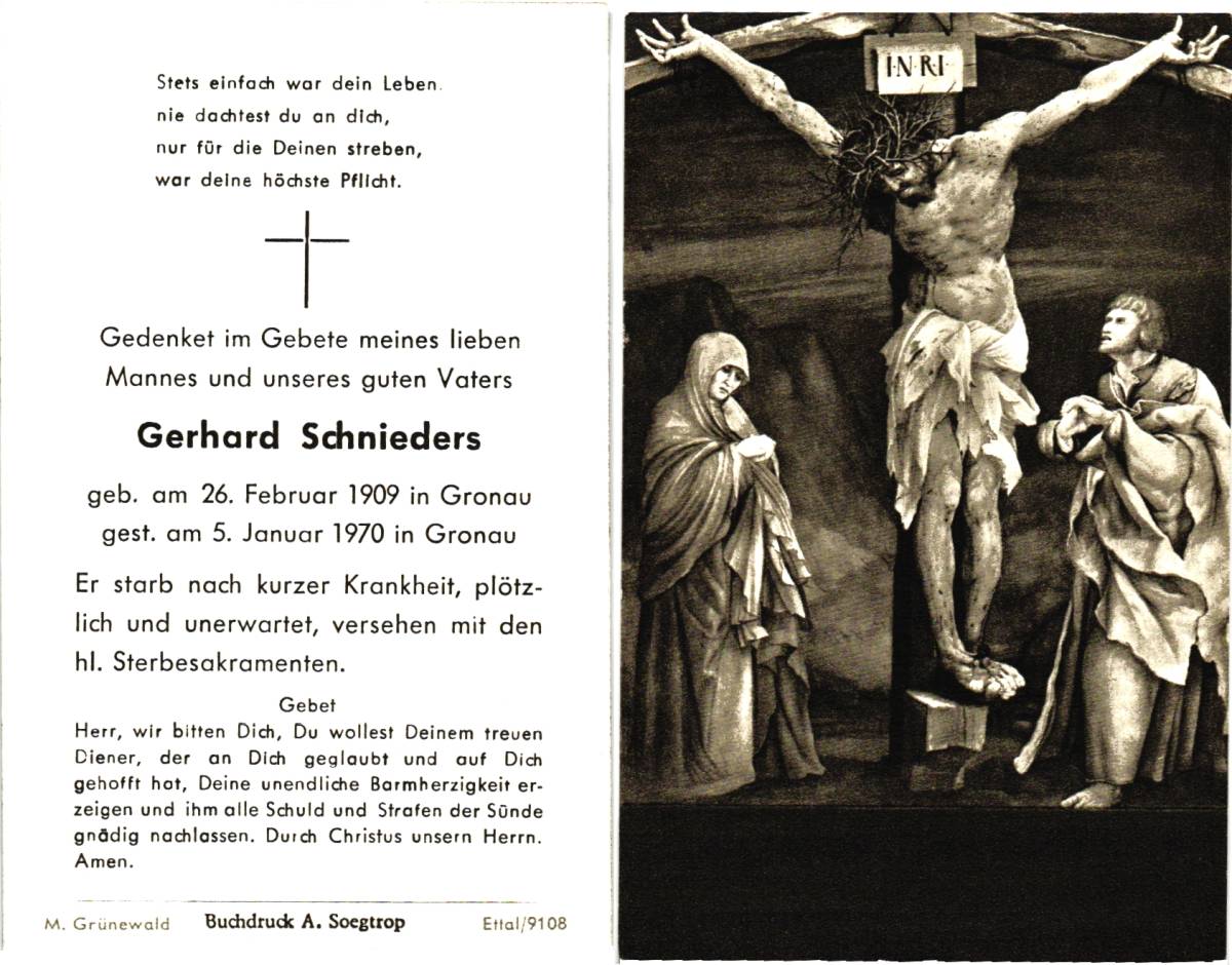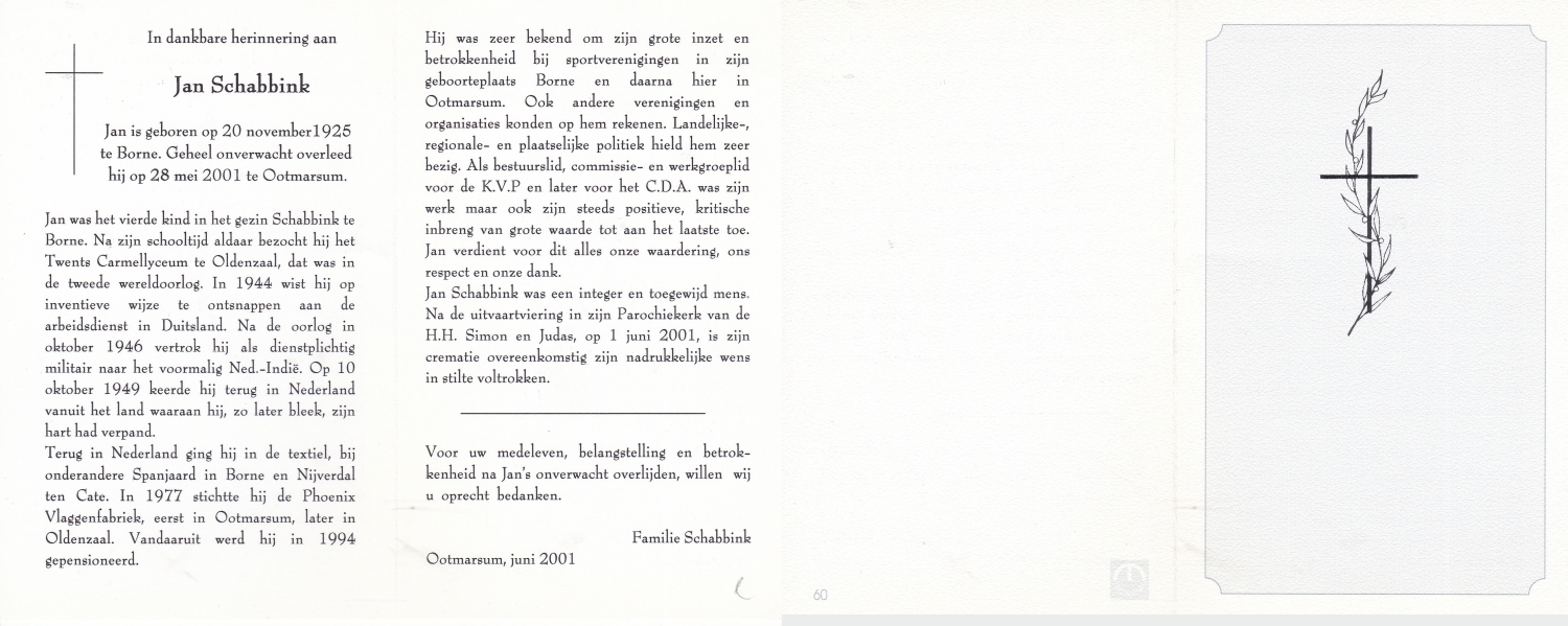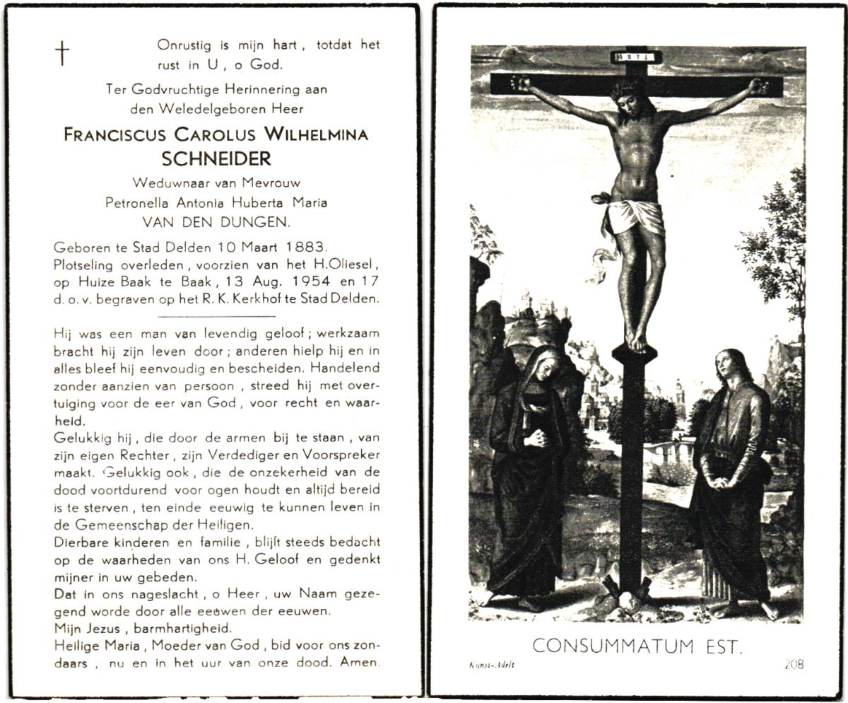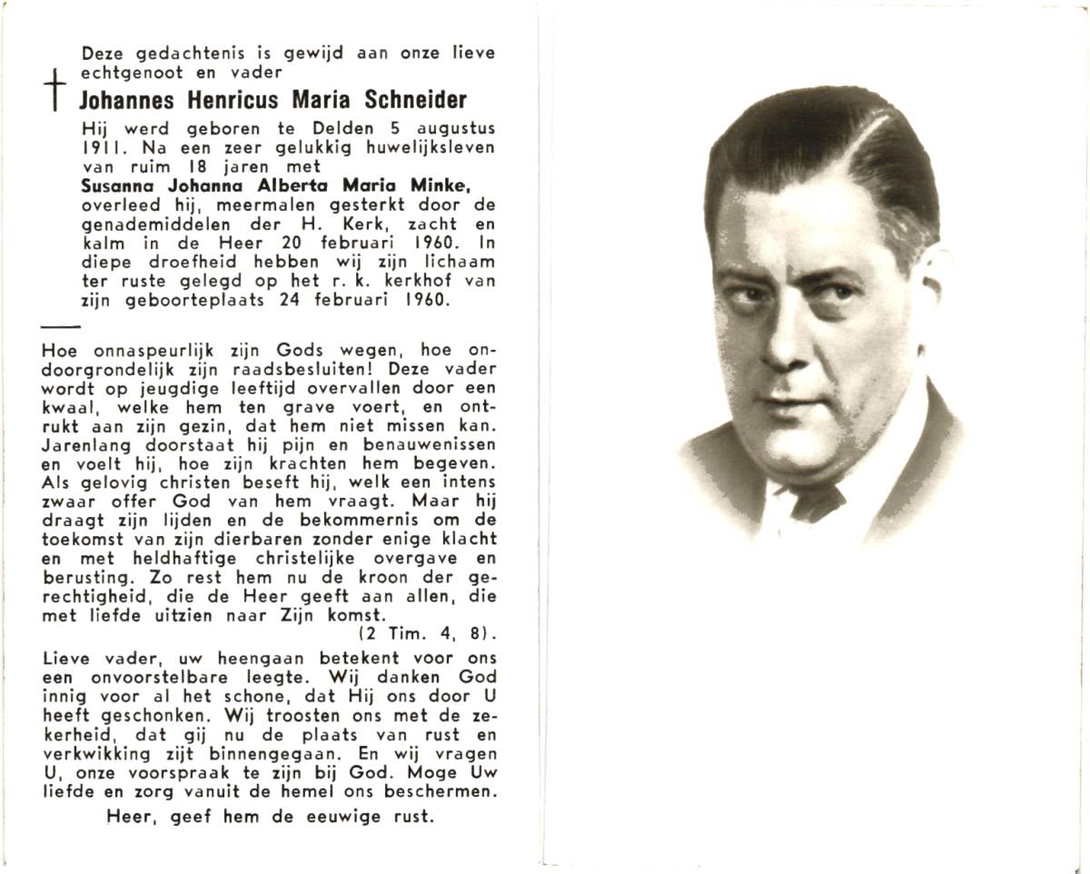 SCHNEIDER, Johannes Henricus Maria, geboren op 5-8-1911 te Delden, overleden op 20-2-1960 te Delden op 48-jarige leeftijd, begraven op 24-2-1960 te Delden.