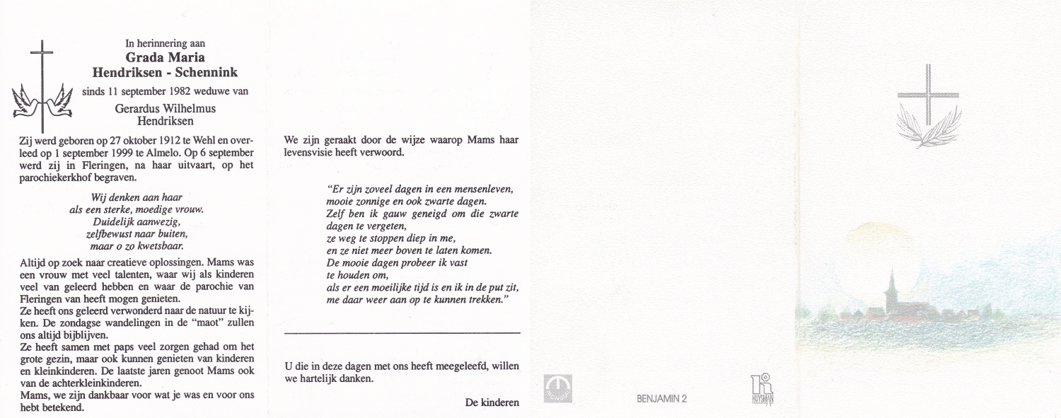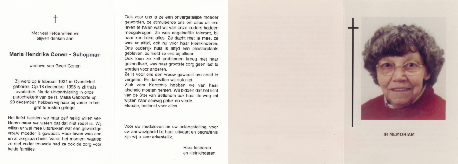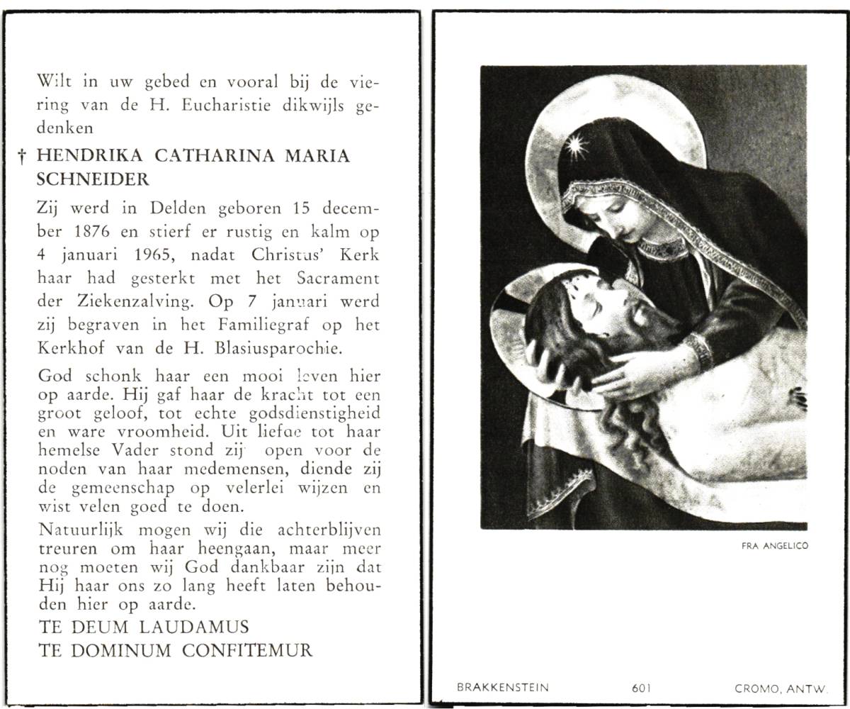 SCHNEIDER, Hendrika Catharina Maria, geboren op 15-12-1876 te Delden, overleden op 4-1-1965 te Delden op 88-jarige leeftijd, begraven op 7-1-1965 te Delden.