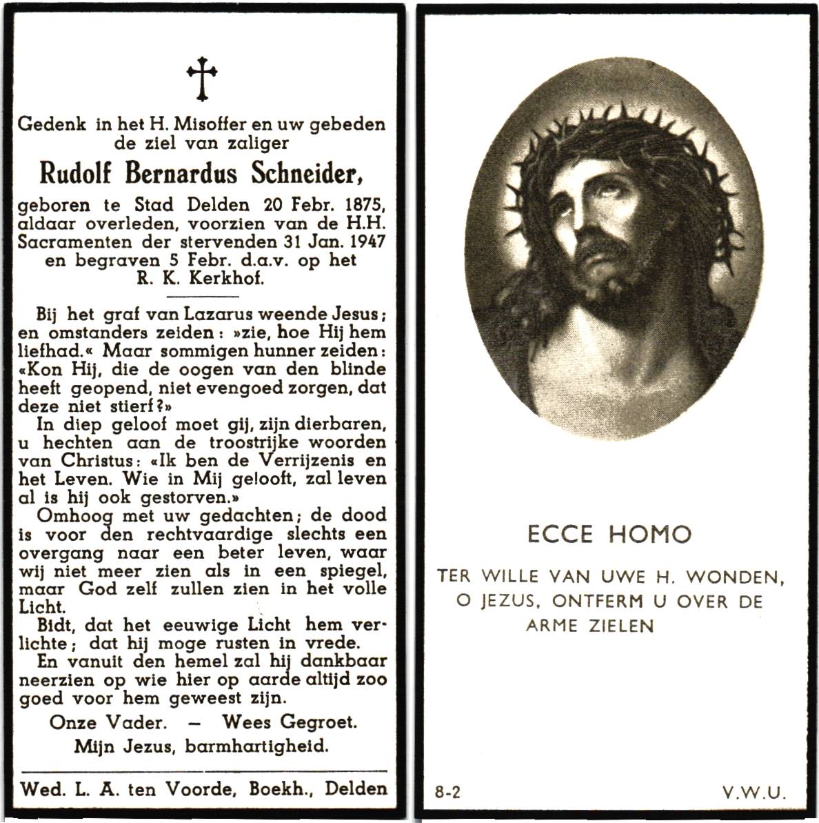 SCHNEIDER, Rudolf Bernardus, geboren op 20-02-1875 te Delden, Stad, overleden op 31-1-1947 te Delden, Stad op 71-jarige leeftijd, begraven op 5-2-1947 te Delden.
