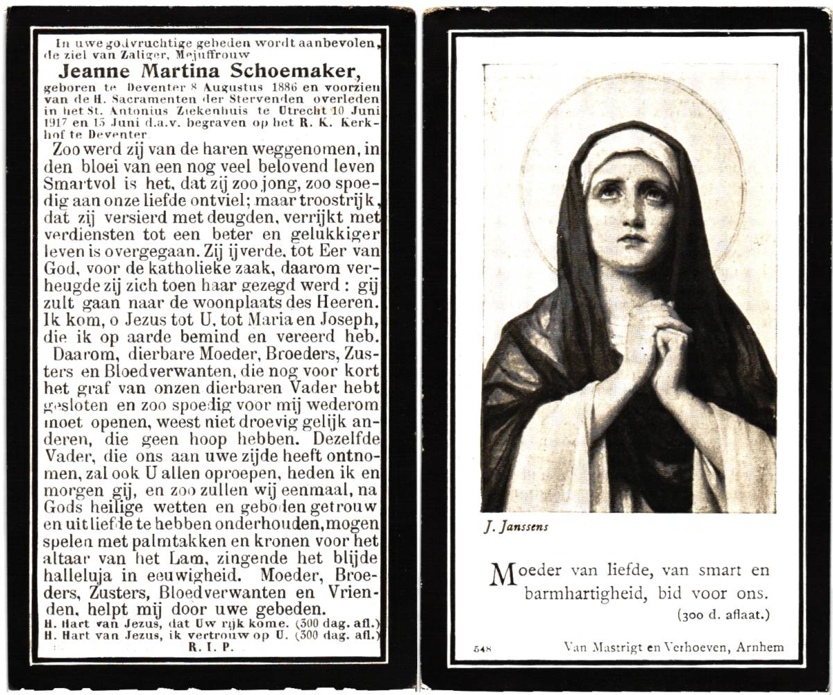 SCHOEMAKERS, Jeanne Martina, geboren op 08-08-1886 te Deventer, overleden op 10-6-1917 te Utrecht, ziekenhuis op 30-jarige leeftijd, begraven op 13-6-1917 te Deventer.