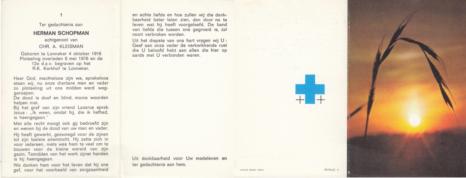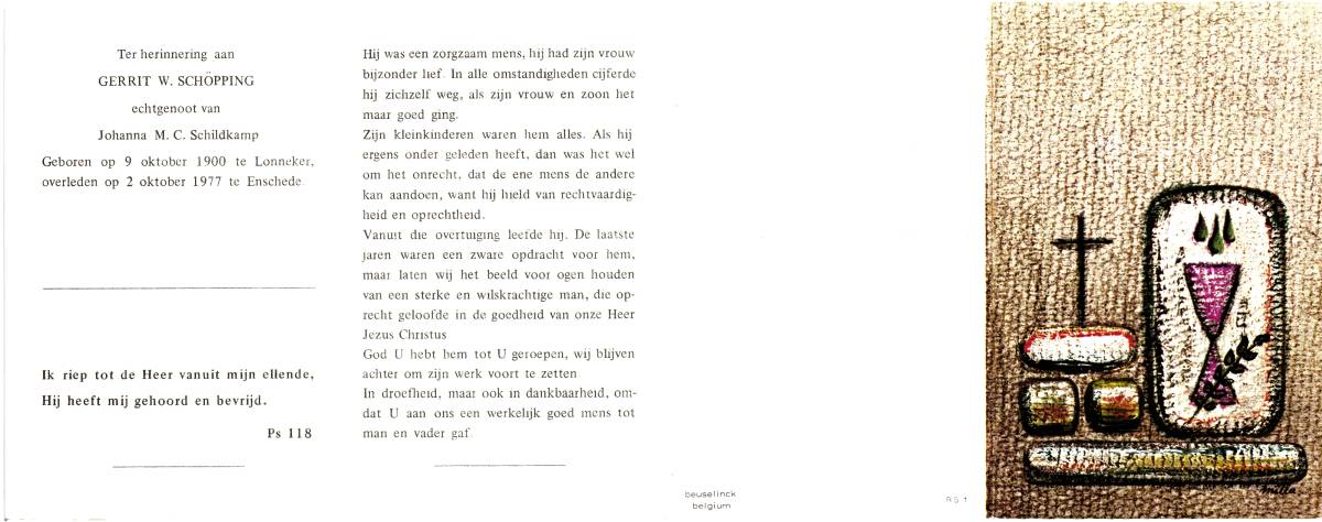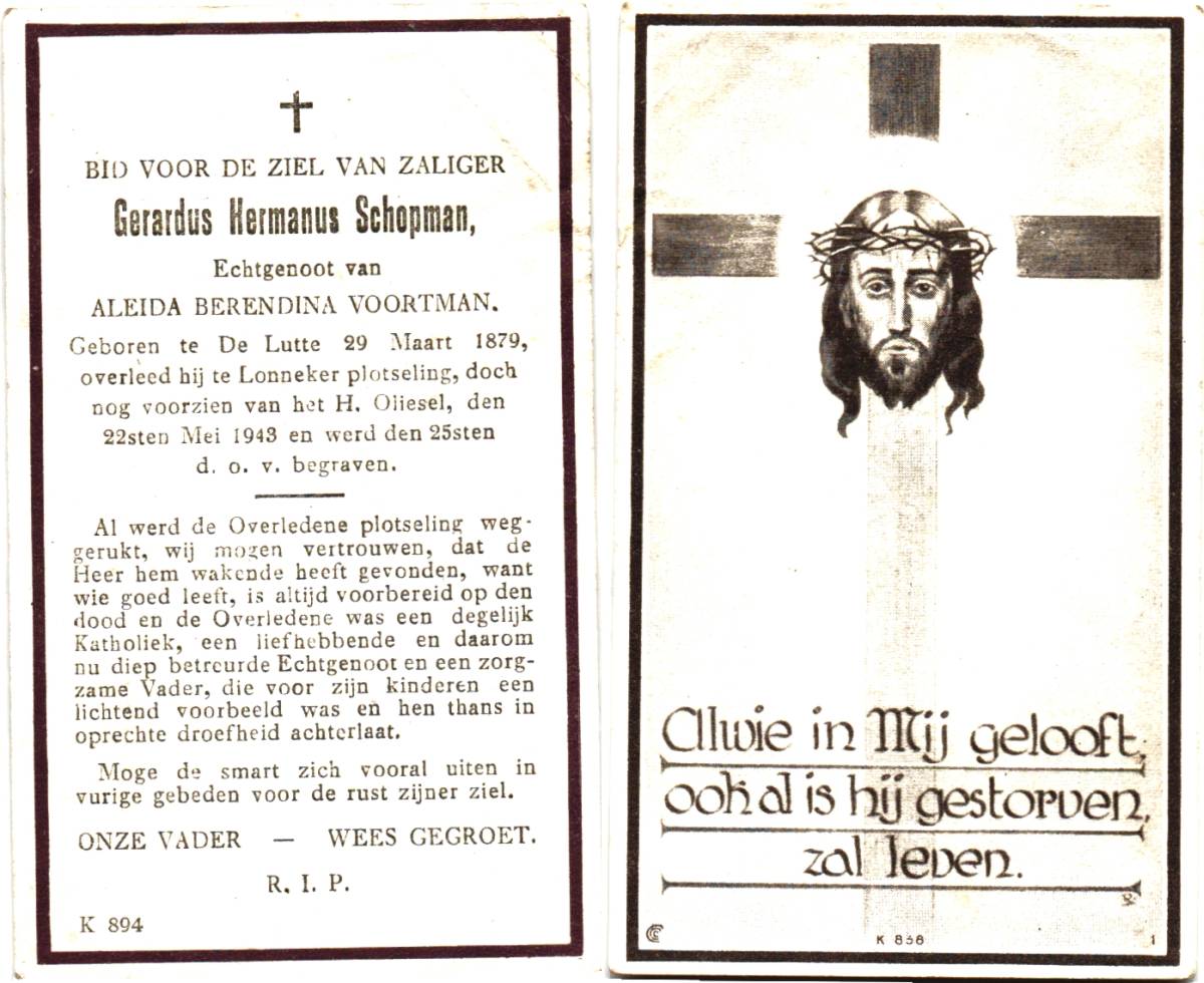 SCHOPMAN, Gerardus Hermanus, geboren op 29-03-1879 te De Lutte, overleden op 22-5-1943 te Lonneker op 64-jarige leeftijd, begraven op 25-5-1943 te Lonneker.