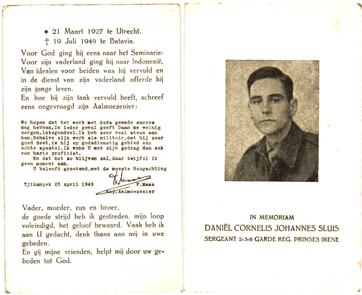 SLUIS, Daniel Cornelis Johannes, geboren op 21-3-1927 te Utrecht, overleden op 19-7-1949 te Batavia, Indon. op 22-jarige leeftijd.