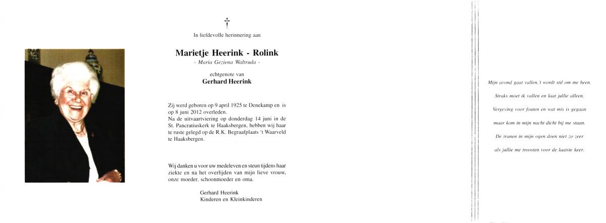 RORINK, Johanna Maria, geboren op 10-10-1887 te Deurningen, overleden op 3-2-1969 te Losser op 81-jarige leeftijd, begraven op 6-2-1969 te Losser.