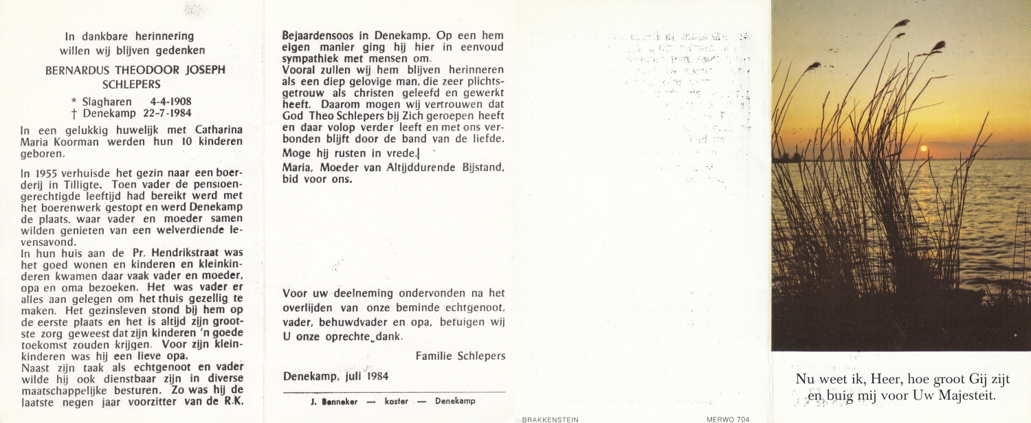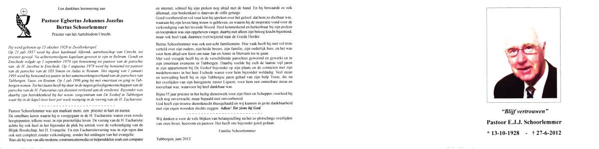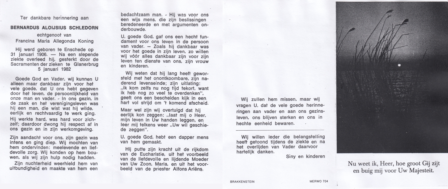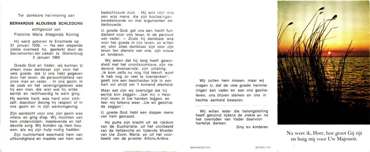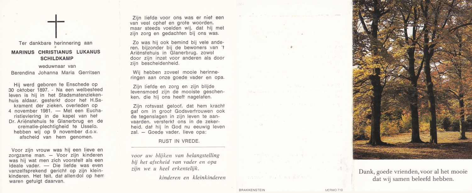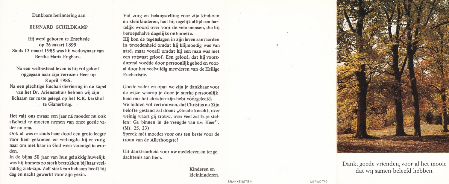 SCHILDKAMP, Engbertus Joannes Ger. Majella, geboren op 8-6-1907 te Lonneker, overleden op 13-3-1972 te Nijmegen op 64-jarige leeftijd, begraven op 16-3-1972 te Nijmegen.