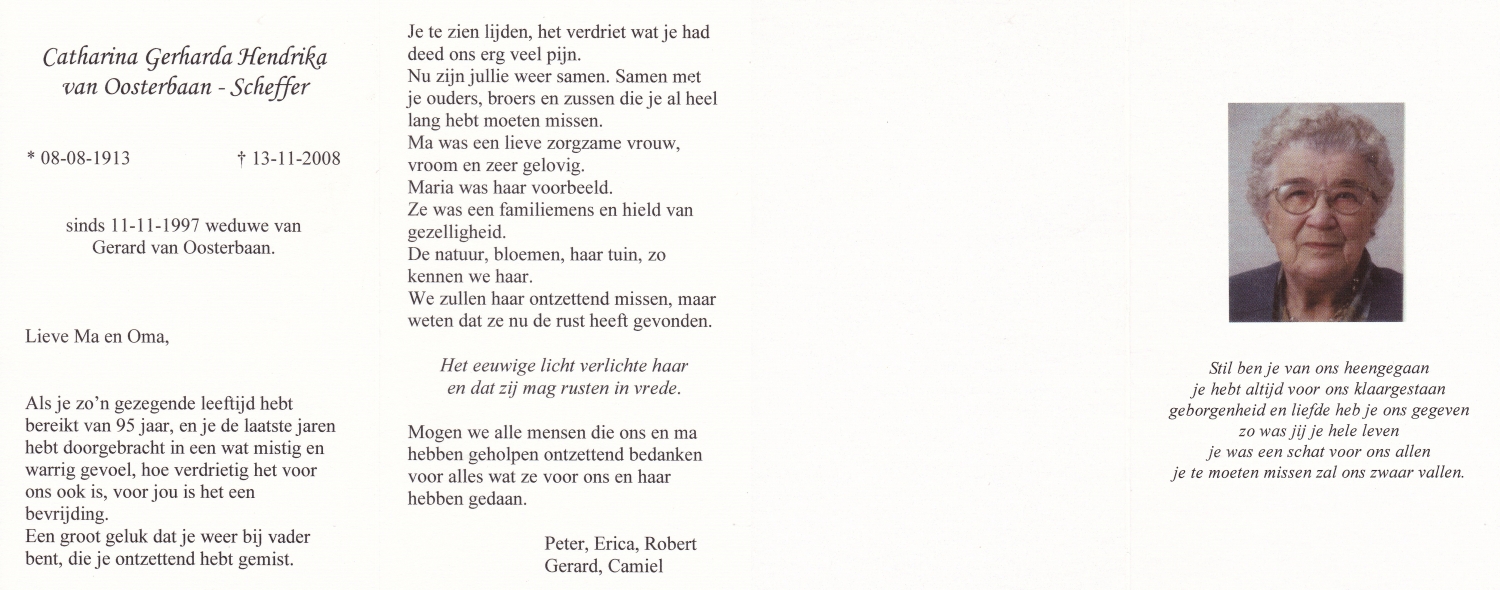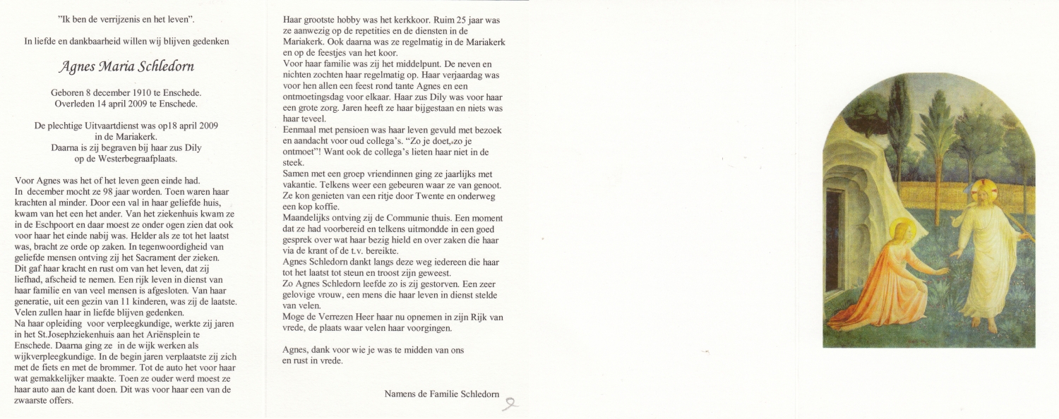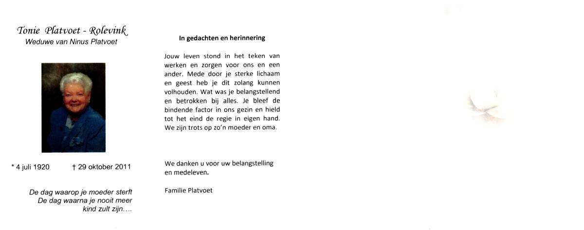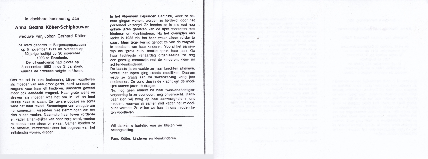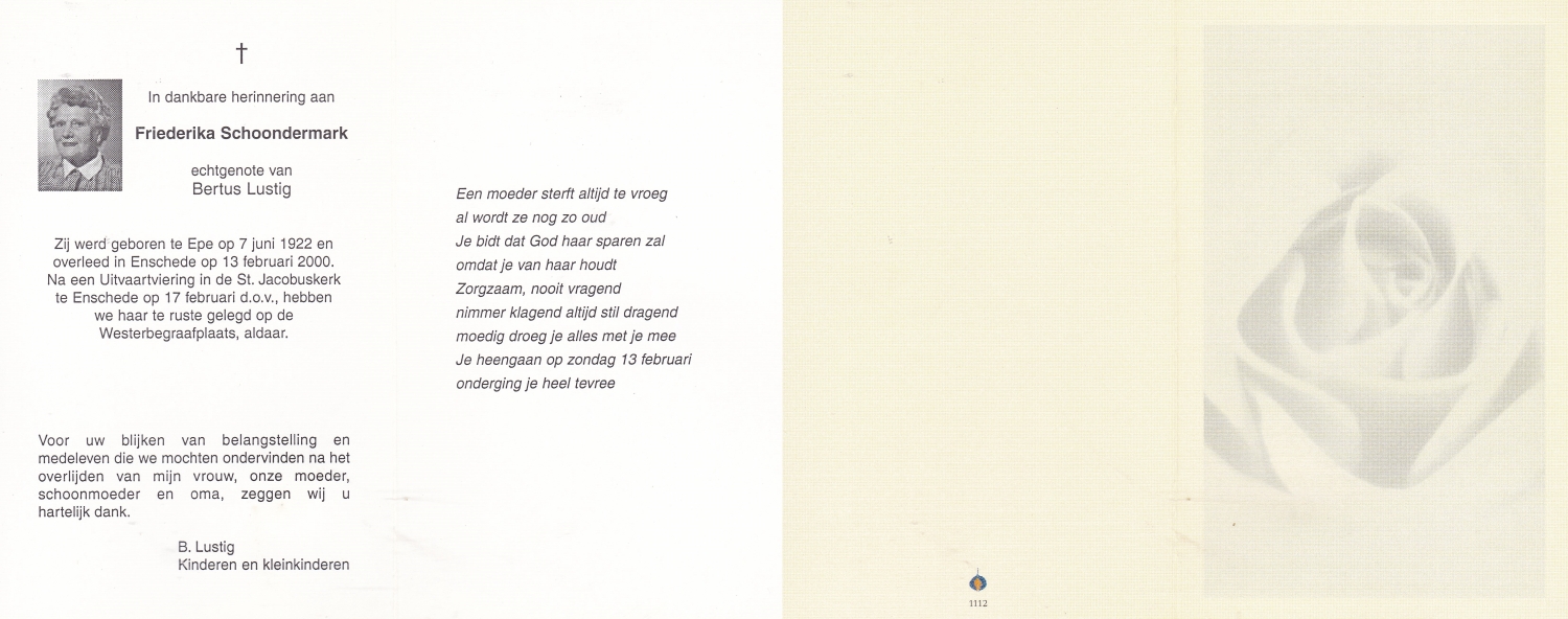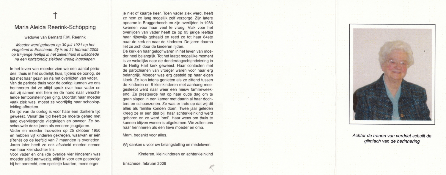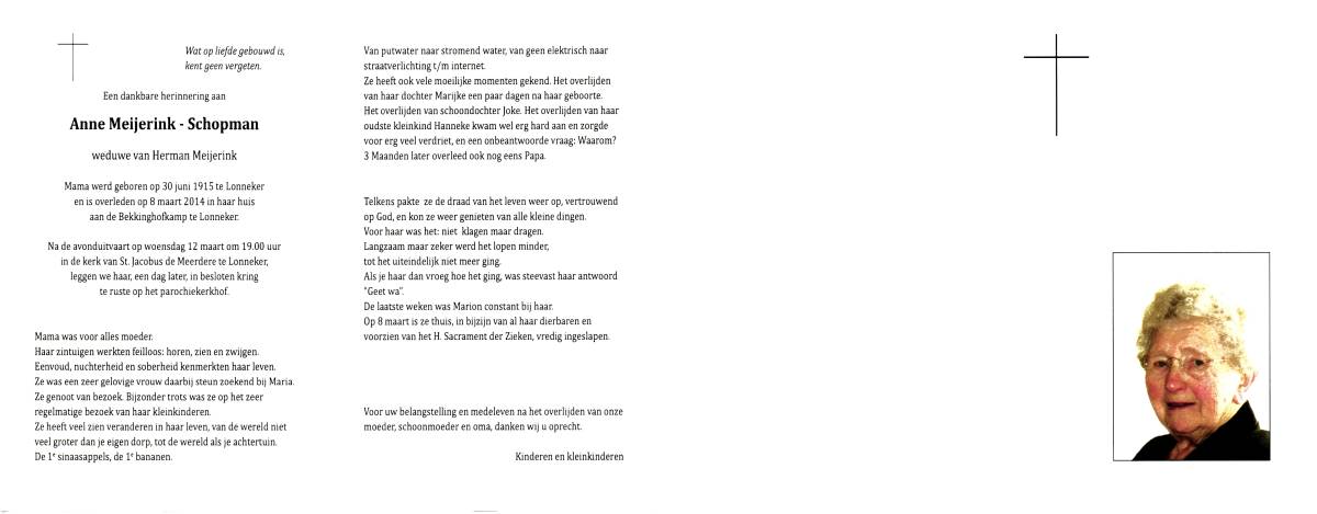 SCHOPMAN, Anne, geboren op 30-6-1915 te Lonneker, overleden op 8-3-2014 te Lonneker op 98-jarige leeftijd, begraven op 12-3-2014 te Lonneker.