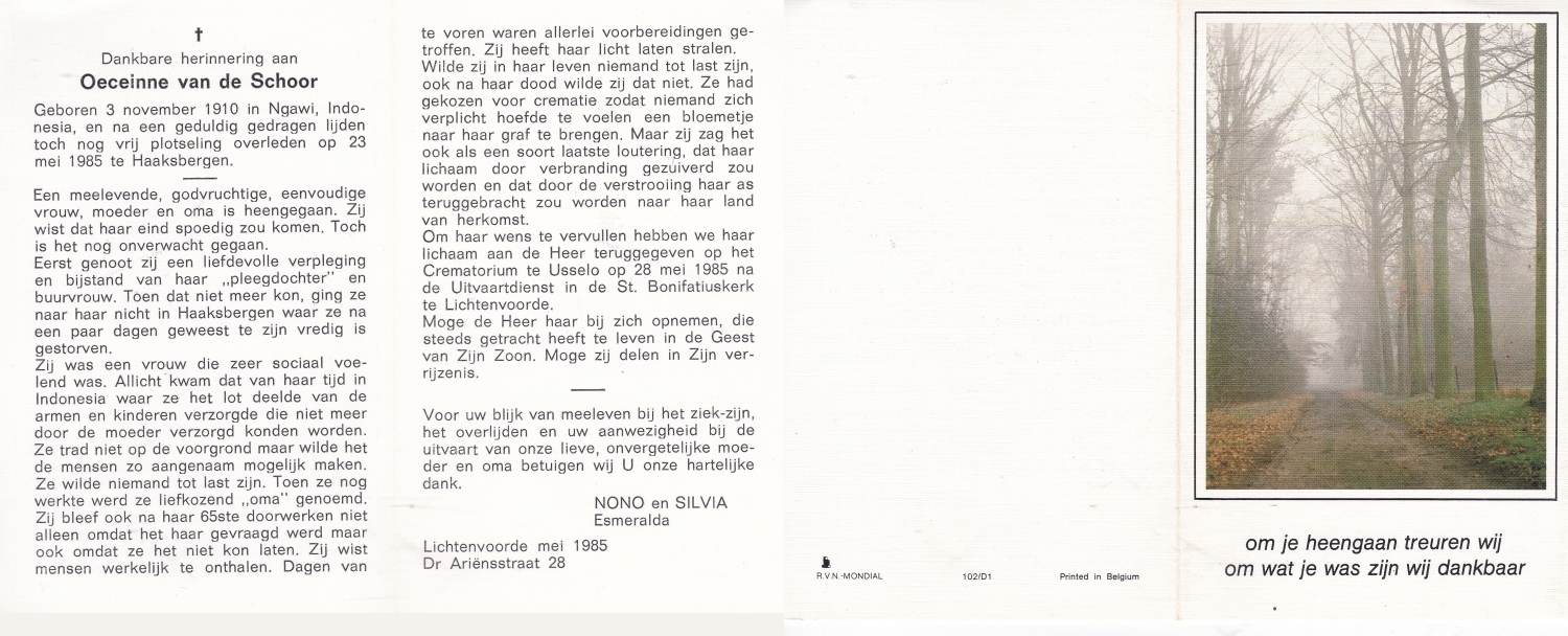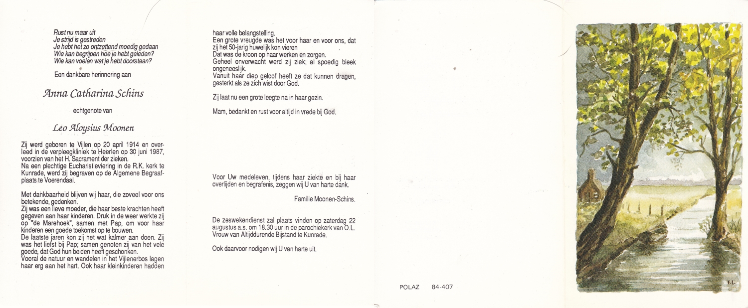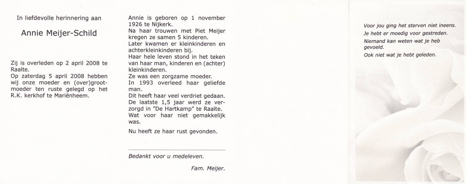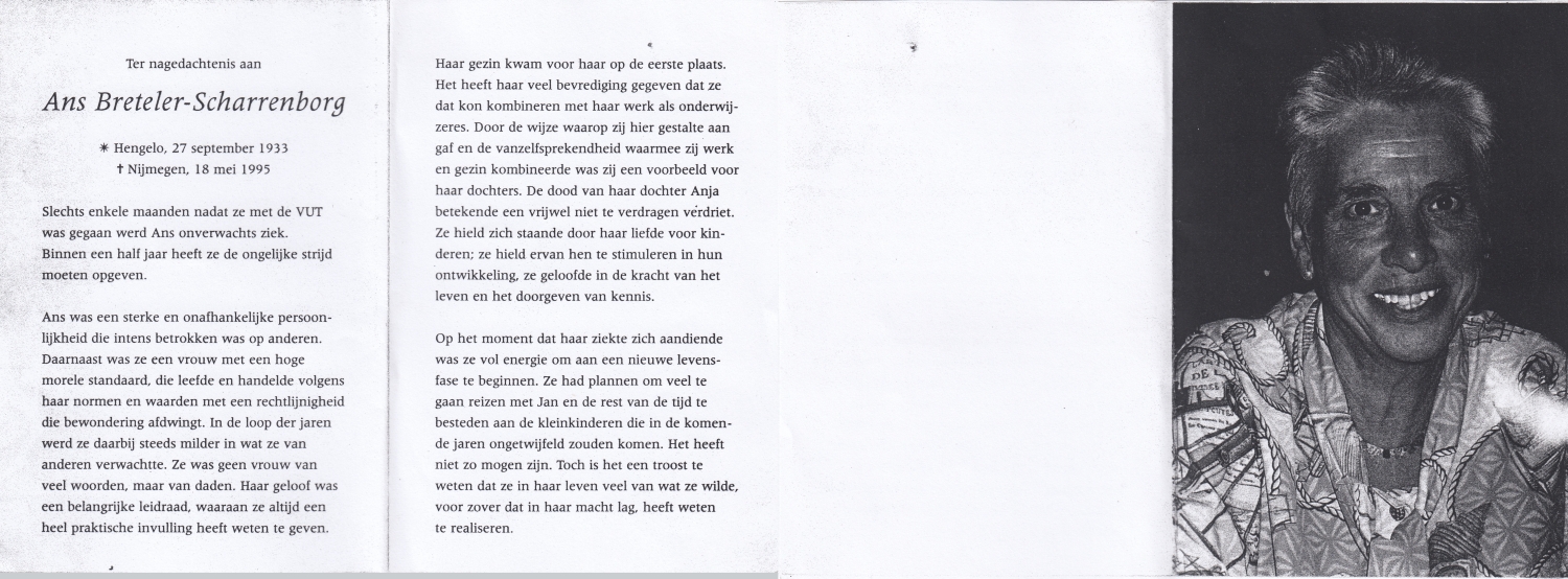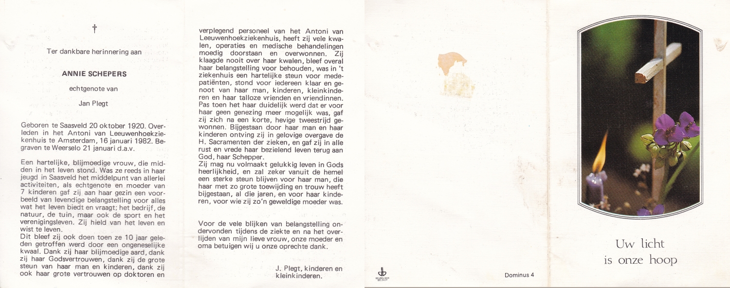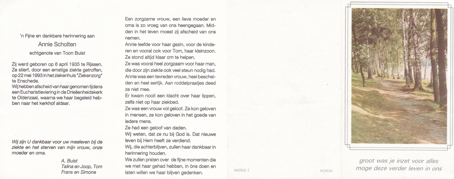 SCHOPMAN, Anne, geboren op 30-6-1915 te Lonneker, overleden op 8-3-2014 te Lonneker op 98-jarige leeftijd, begraven op 12-3-2014 te Lonneker.