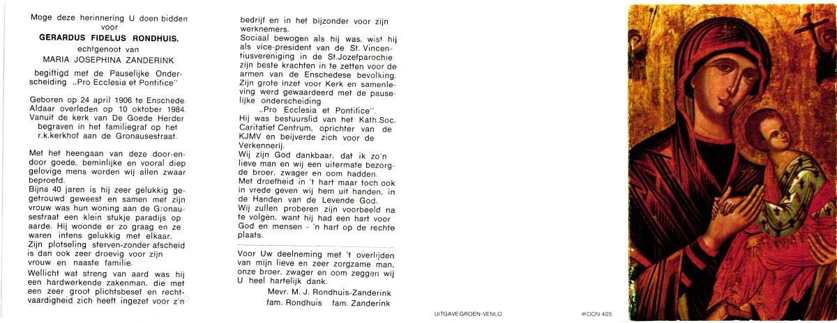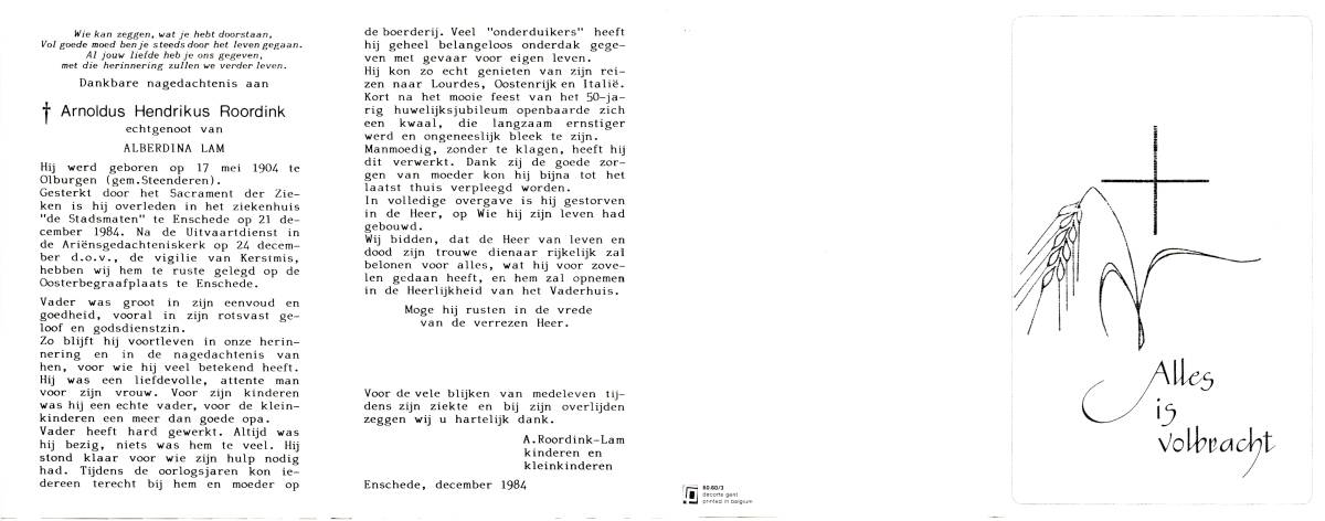 ROORDINK, Arnoldus Hendrikus, geboren op 17-5-1904 te Steenderen, Olburgen, overleden op 21-12-1984 te Enschede, ziekenhuis op 80-jarige leeftijd, begraven op 24-12-1984 te Enschede.