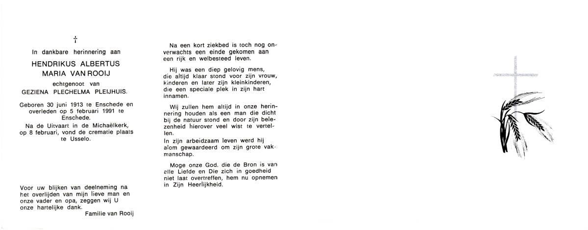 ROOIJ, van, Hendrikus Albertus Maria, geboren op 30-6-1913 te Enschede, overleden op 5-2-1991 te Enschede op 77-jarige leeftijd, gecremeerd op 8-2-1991 te Usselo.