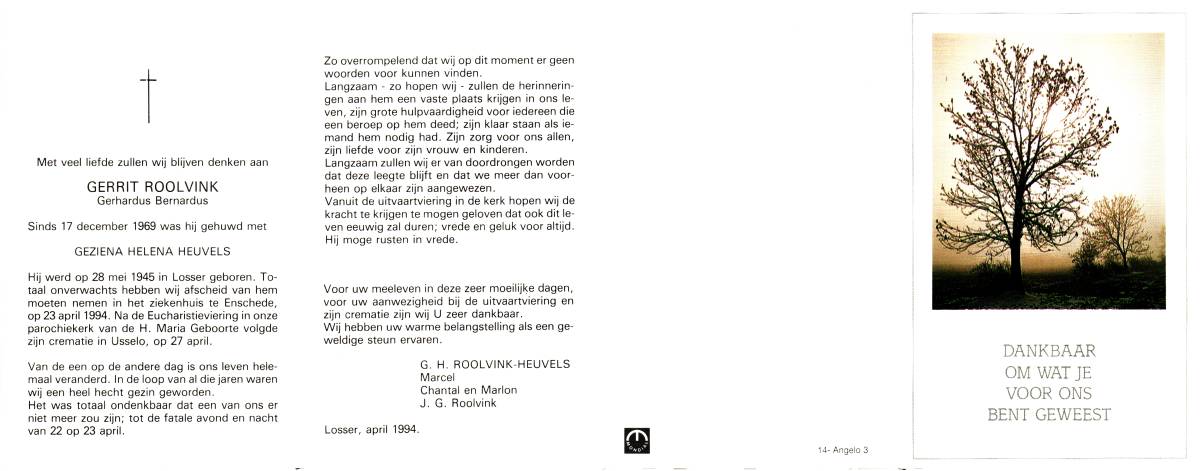 ROOLVINK, Gerrit (Gerhardus Bernardus), geboren op 28-5-1945 te Losser, overleden op 23-4-1994 te Enschede, ziekenhuis op 48-jarige leeftijd, gecremeerd op 27-4-1994 te Usselo.