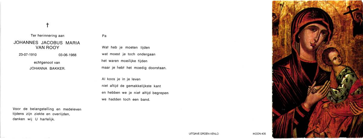 ROOIJ, van, Josephus Johannes Maria, geboren op 4-12-1907 te Enschede, overleden op 5-9-1980 te Enschede, ziekenhuis op 72-jarige leeftijd, gecremeerd op 10-9-1980 te Usselo.
